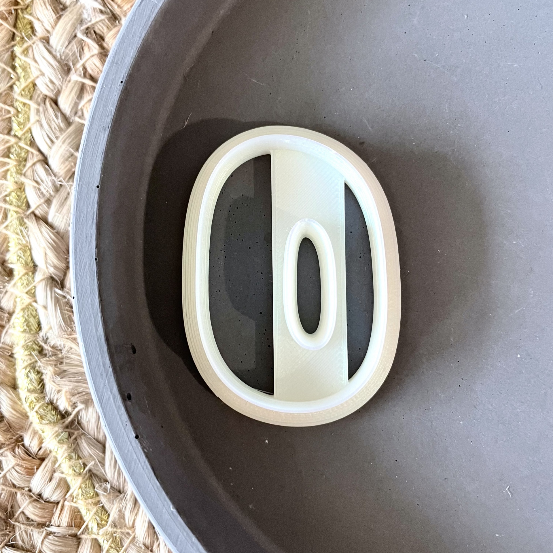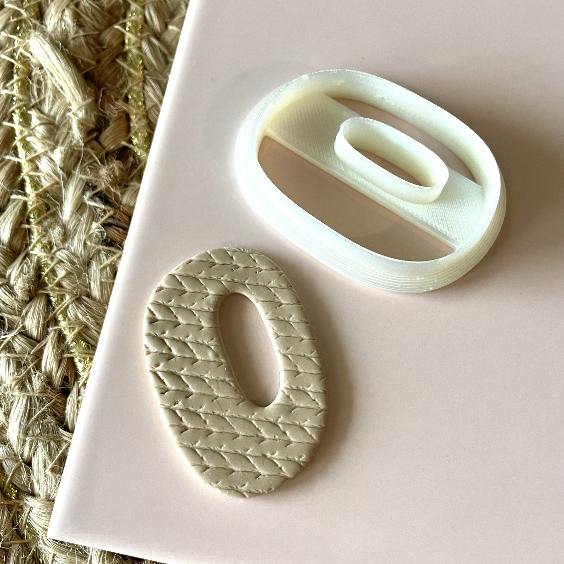 • Molde cortador de biscoito oval branco em assadeira cinza com fibra natural ao lado