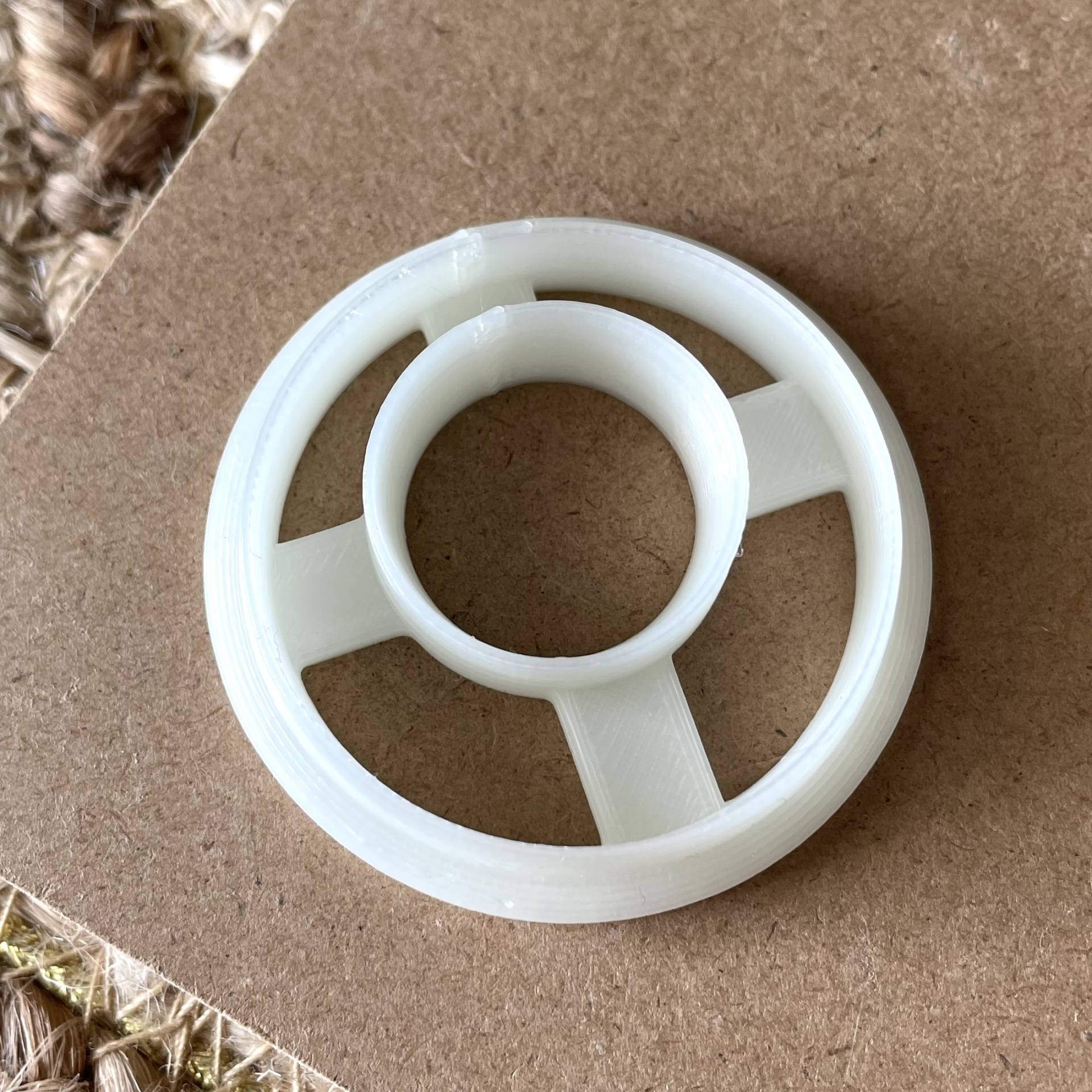• Anel redondo de plástico branco com três barras radiais sobre papel cartão castanho