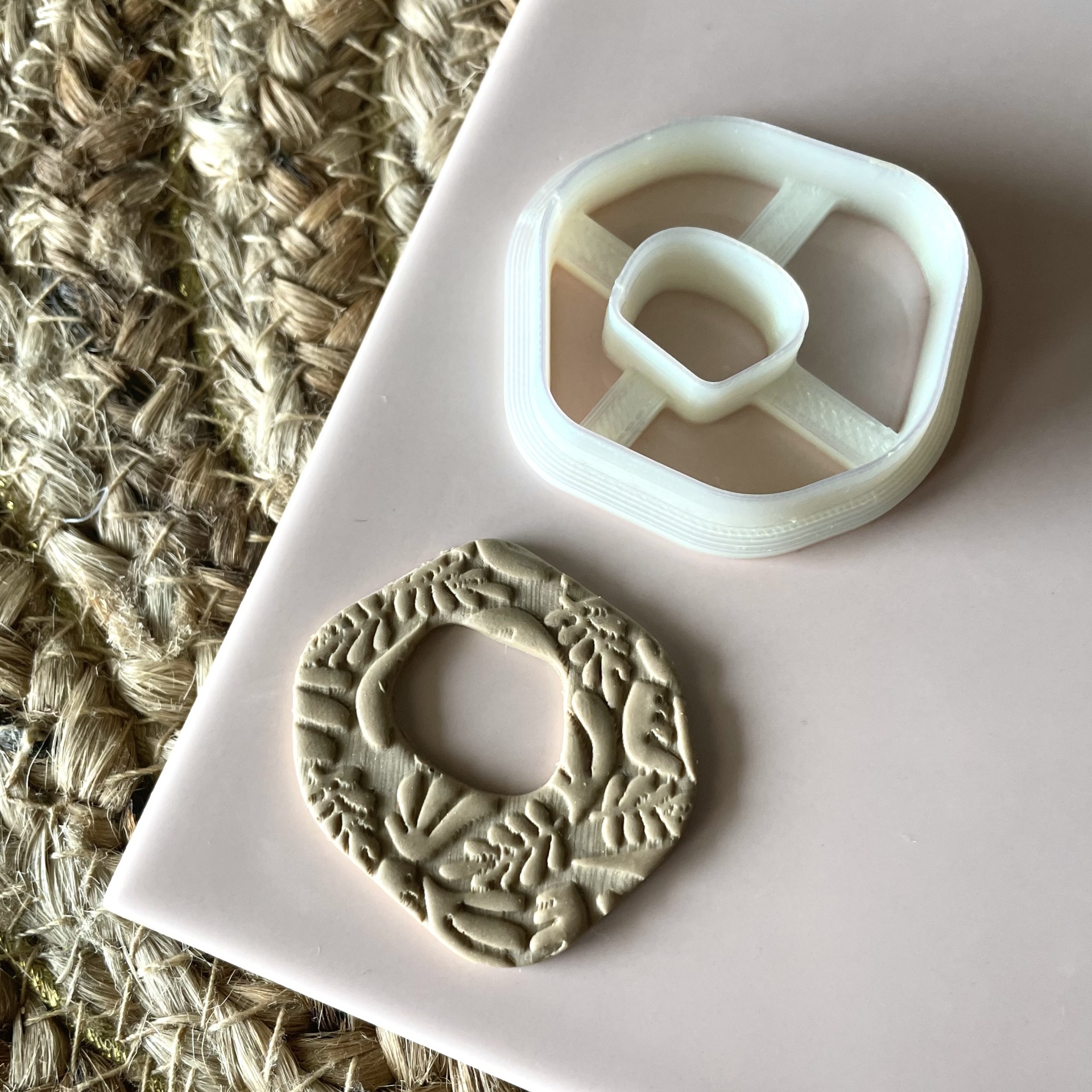 • Cortador de massa branco em plástico e massa cortada com padrão floral