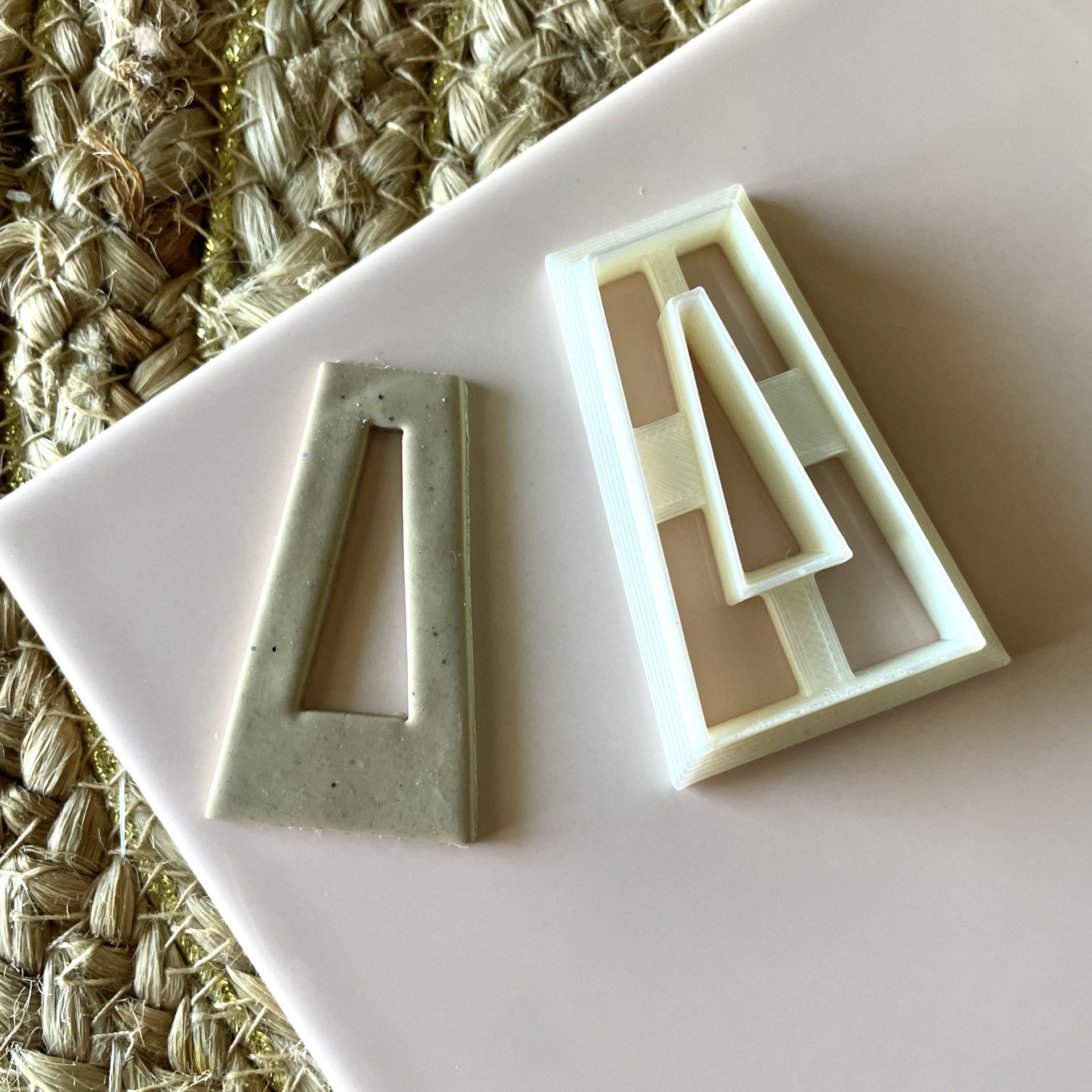 • molde plástico branco e peça cerâmica bege trapezoidal sobre superfície rosa e tapete de palha