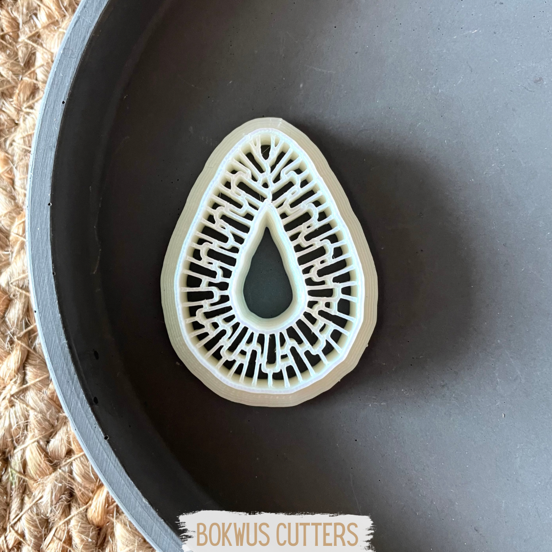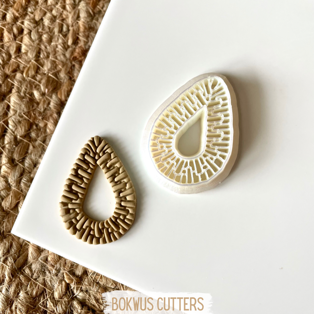 • Cortador e molde em formato de gota com padrão geométrico sobre superfície branca e tapete de fibras naturais