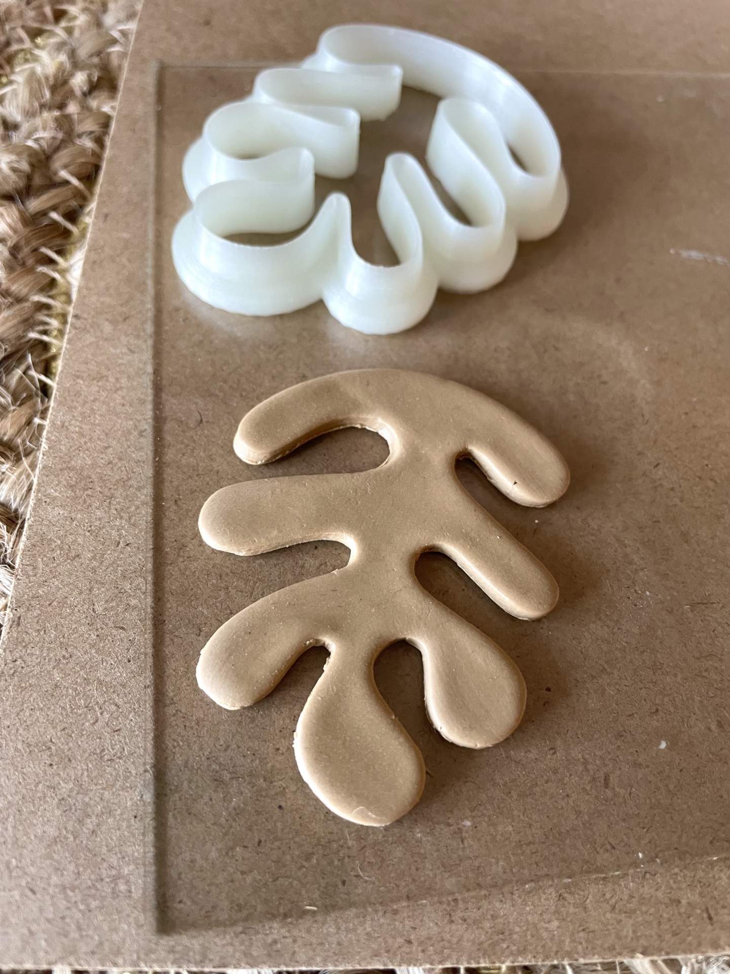Cortador de bolachas branco em forma de folha sobre cartão e tapete natural