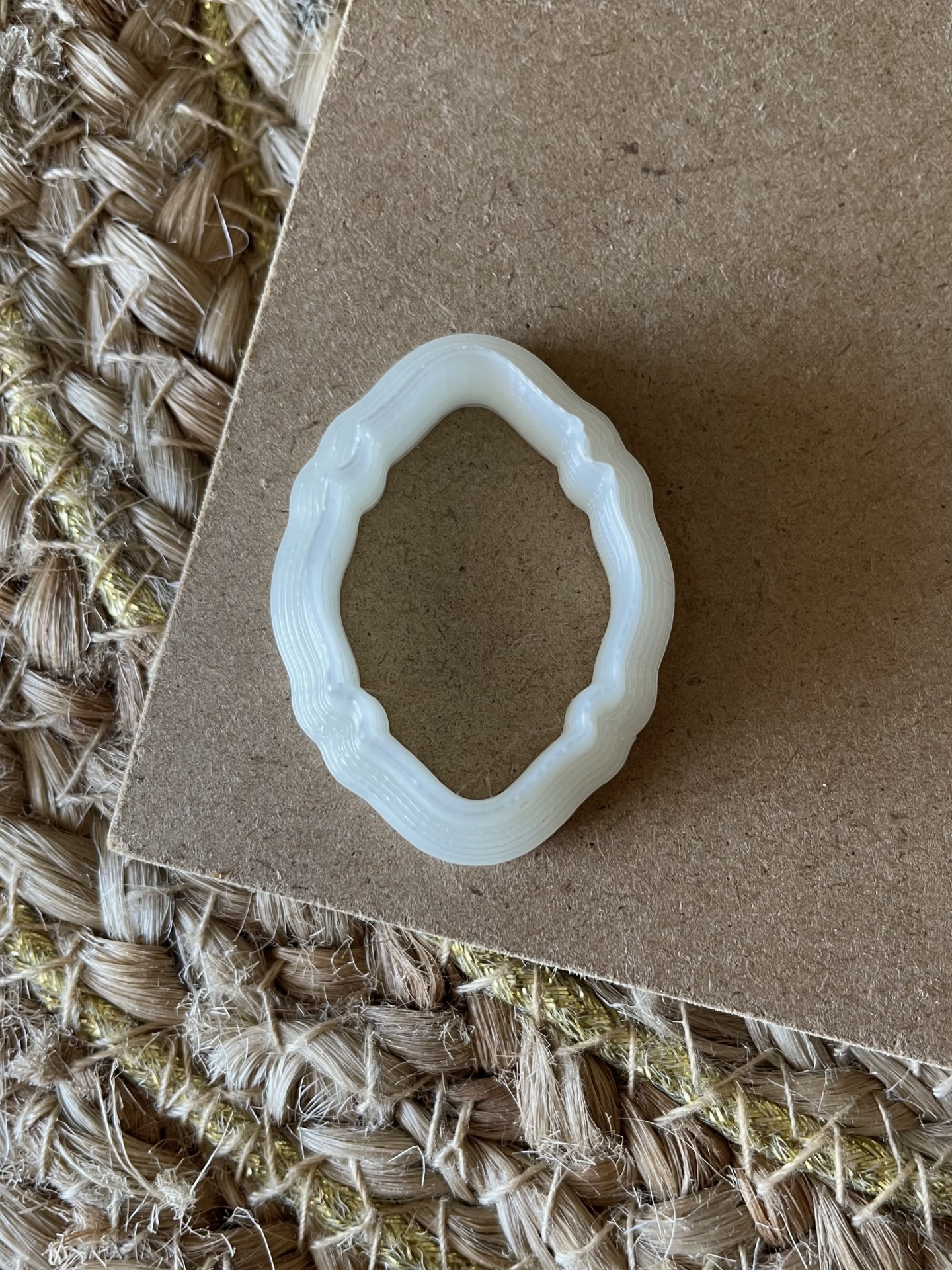 • Anel branco ondulado sobre cartão castanho em tecido rústico.
