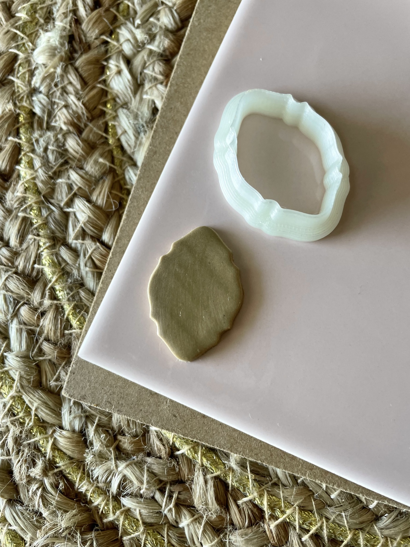 Cortante branco e massa moldada castanha sobre superfície rosa e tecido trançado