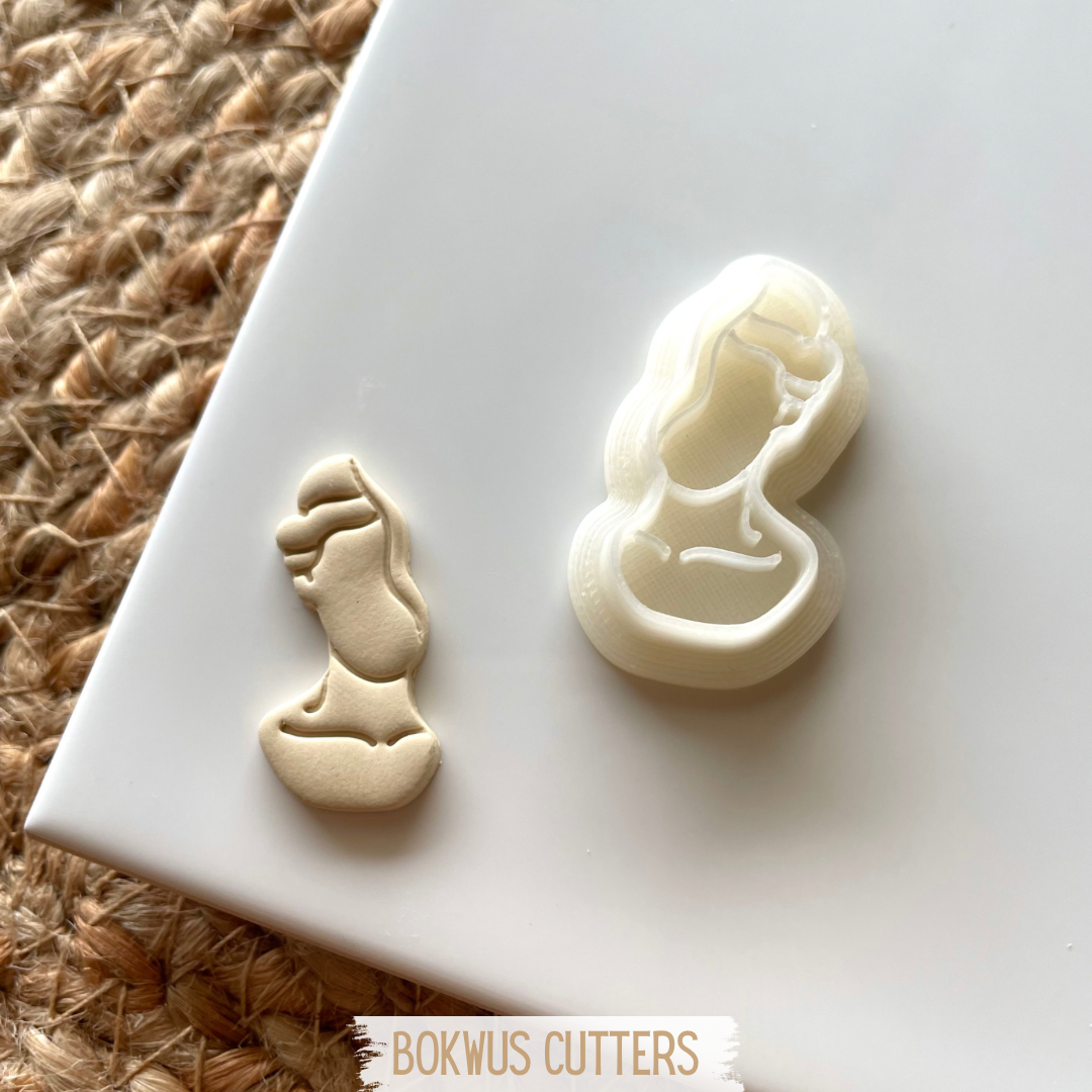 • Corta-biscoitos branco em forma de figura feminina sobre prato preto
