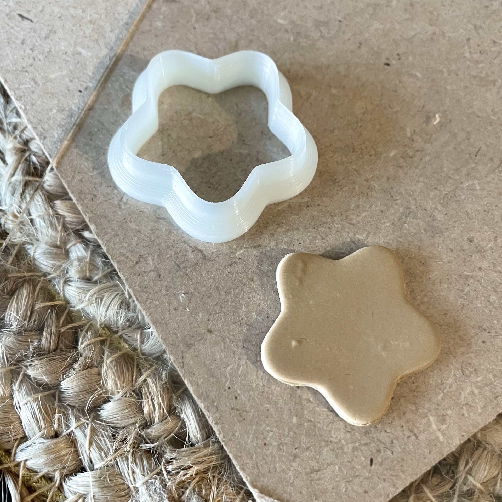 • Cortador de biscoitos branco em forma de flor sobre cartão e tapete natural