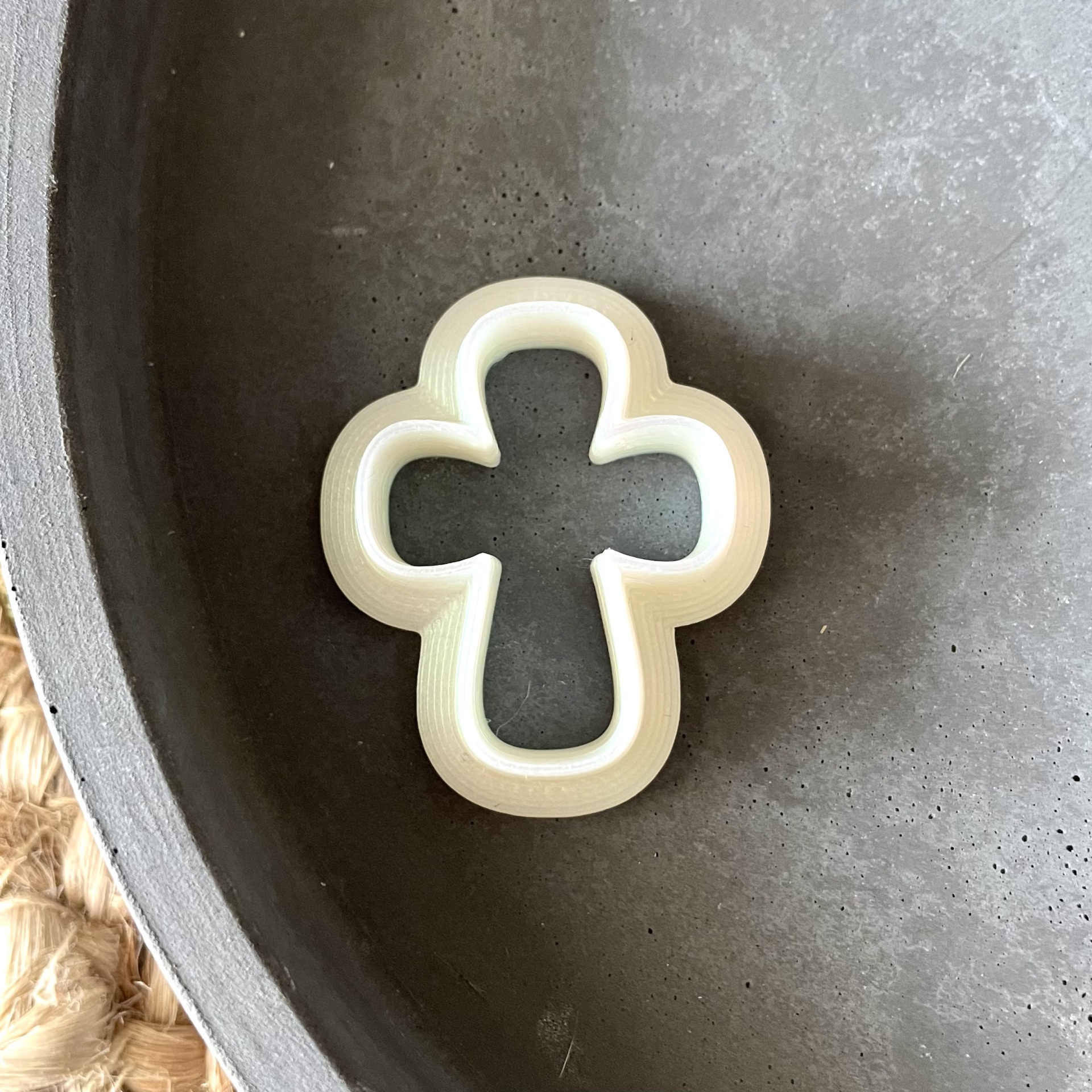 • Cortador de biscoitos em forma de cruz branco dentro de prato cinza