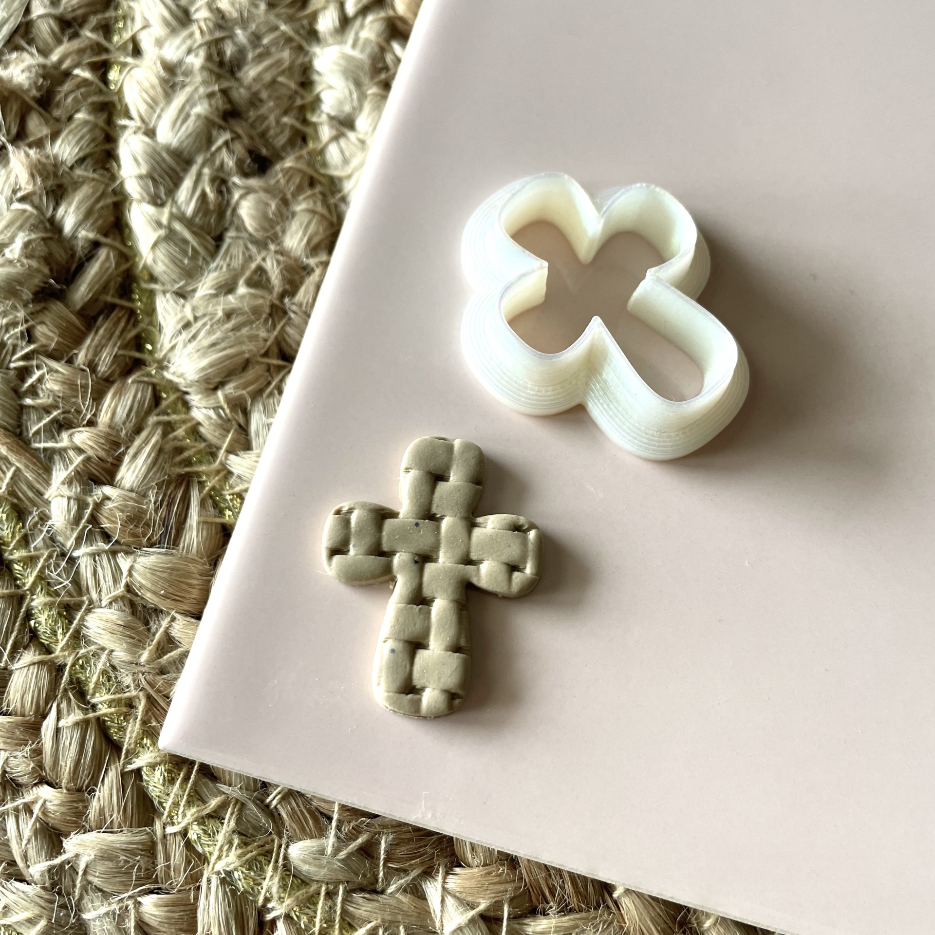 • Cortador de biscoitos branco e biscoito em forma de cruz sobre superfície rosa e juta entrelaçada.