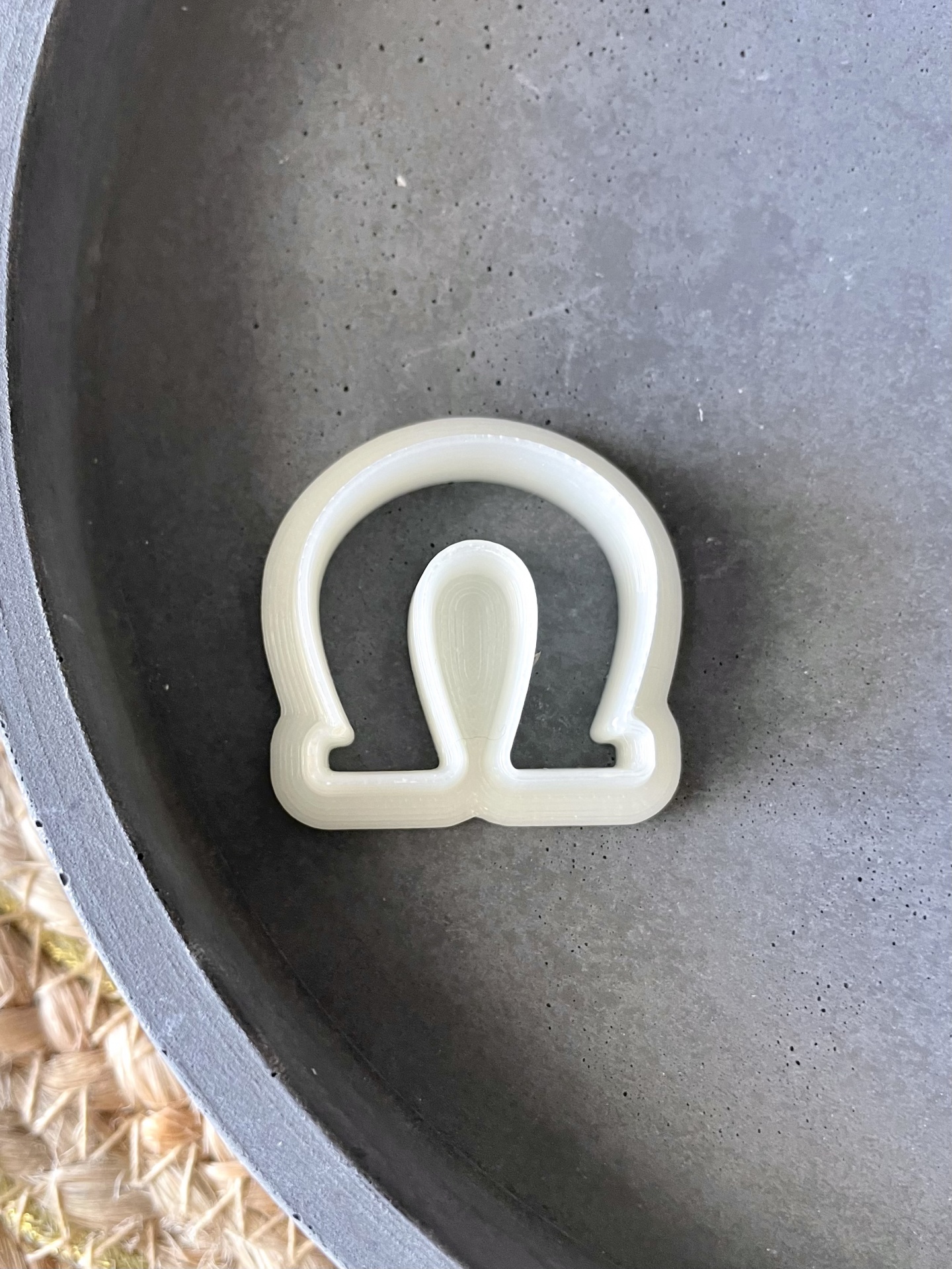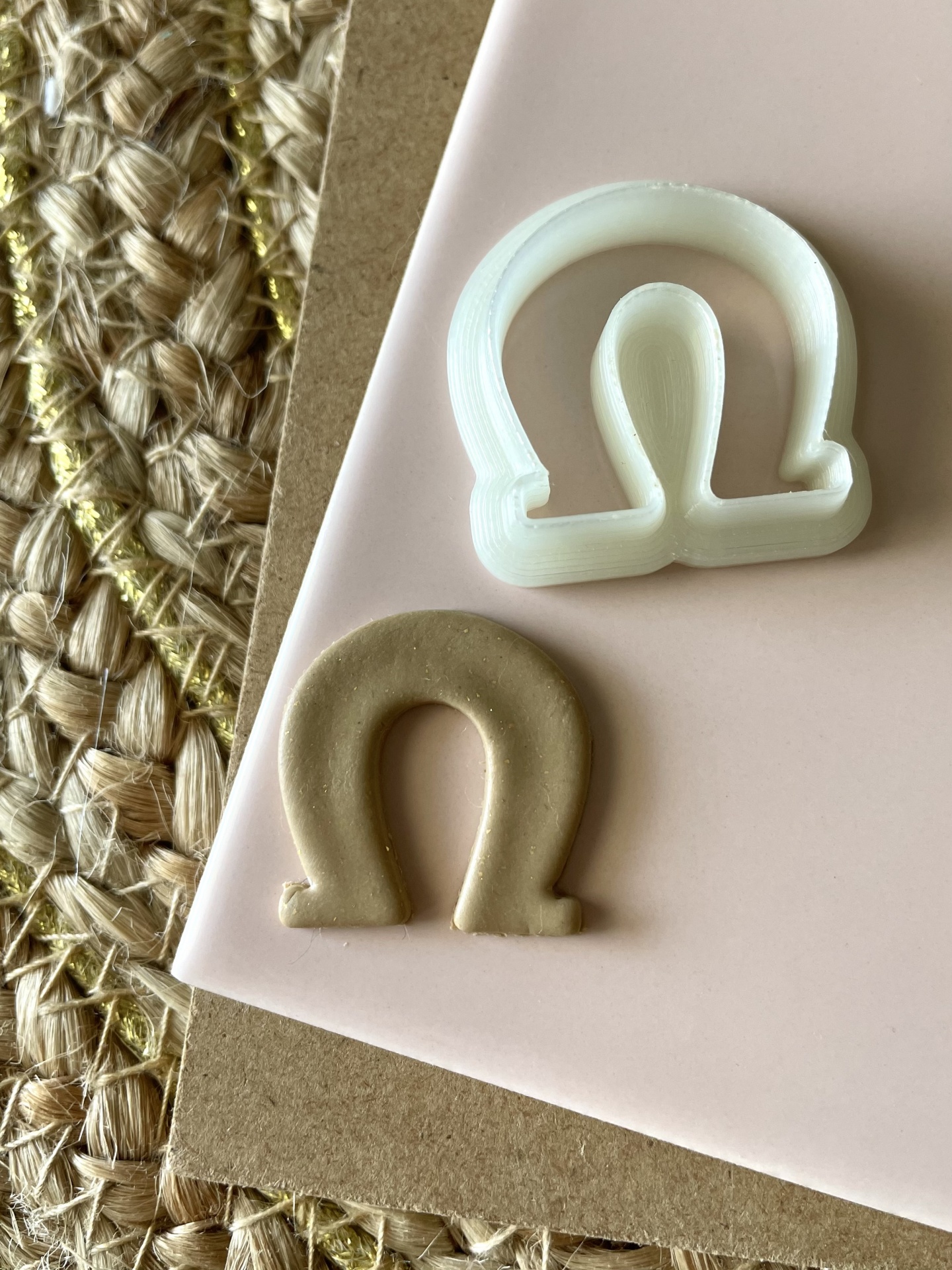 • Molde branco e cookie castanho em forma do símbolo ômega sobre superfície rosa, cartão e tapete de fibras naturais.