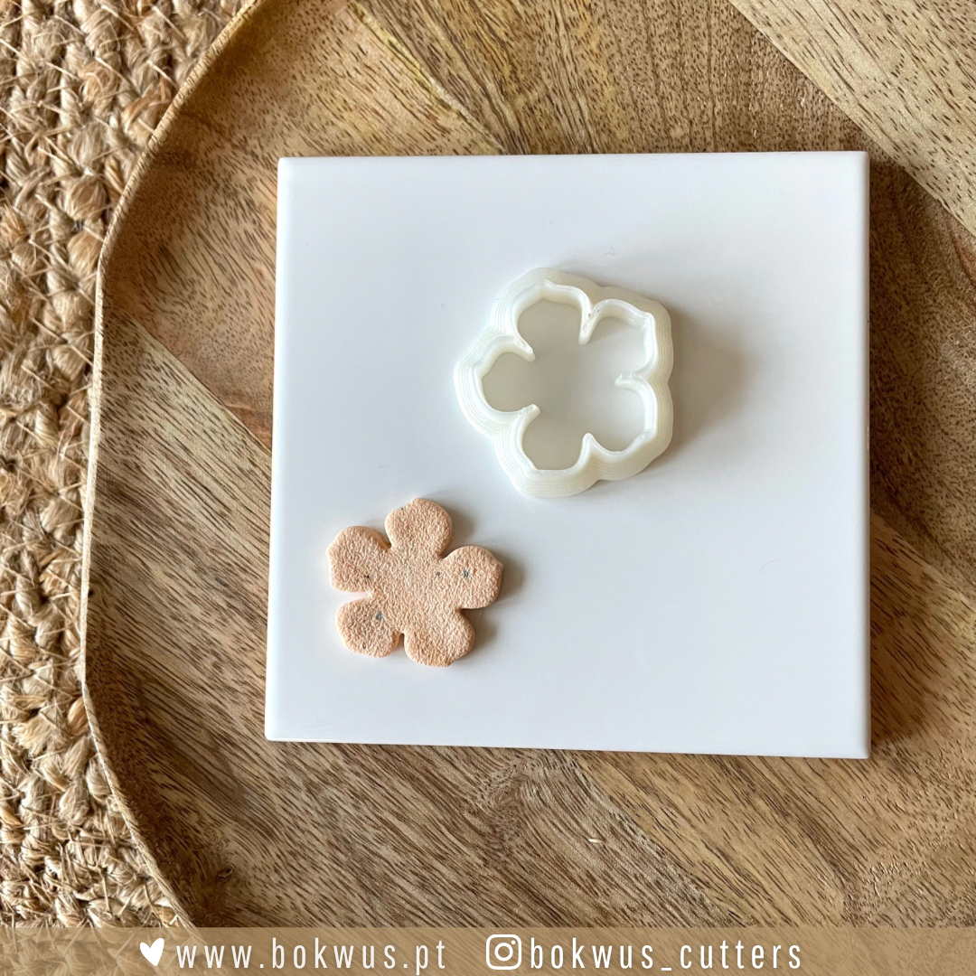• Cortador de biscoitos em forma de flor branco sobre prato cinzento e superfície de ráfia.