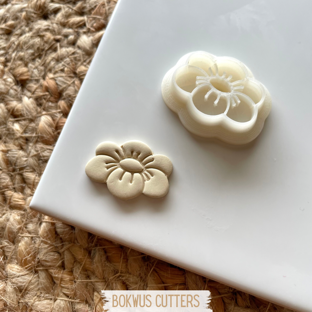• Forma de corte para biscoitos em plástico branco com formato de flor sobre prato cinzento escuro