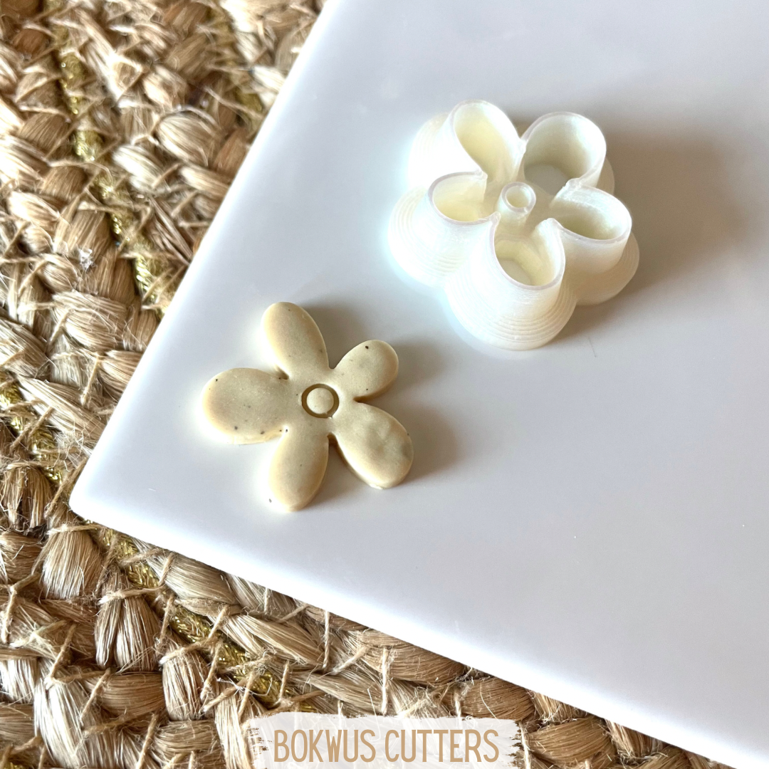 • Cortador branco em forma de flor sobre superfície escura com texto BOKWUS CUTTERS