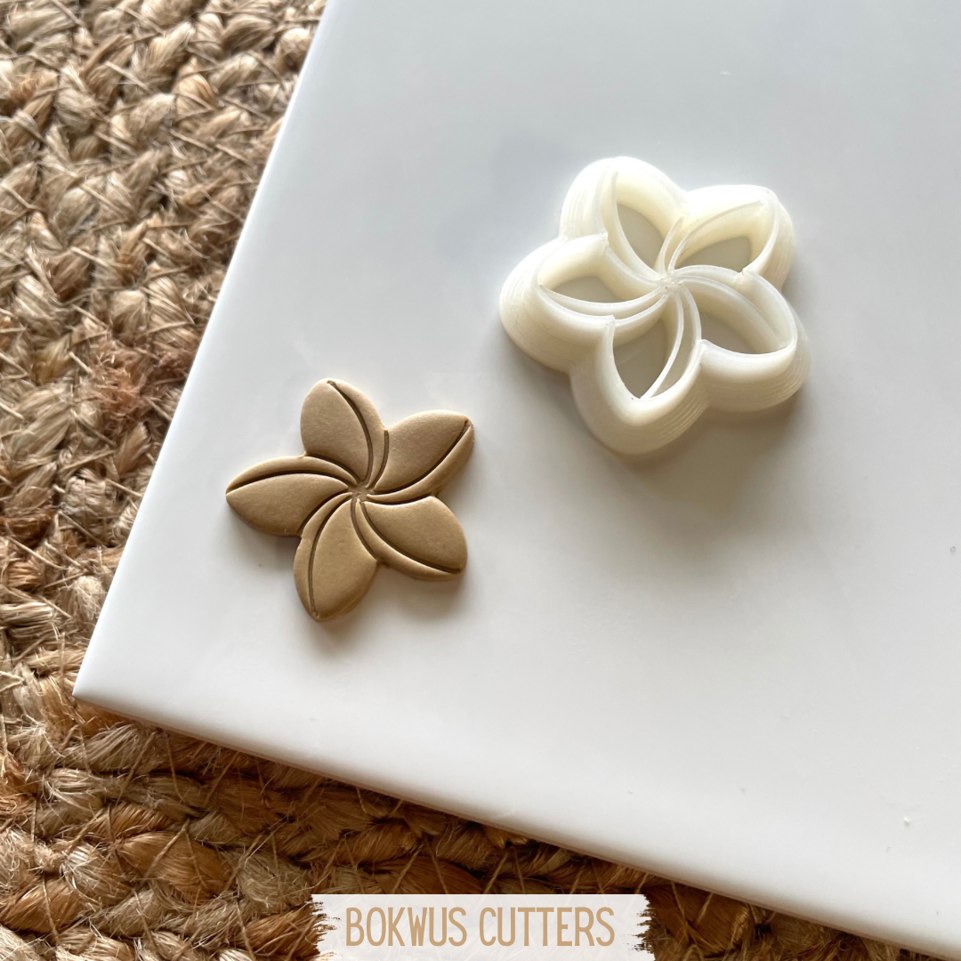 • Cortador e modelo de flor em cinco pétalas sobre placa branca e tapete de fibra natural.