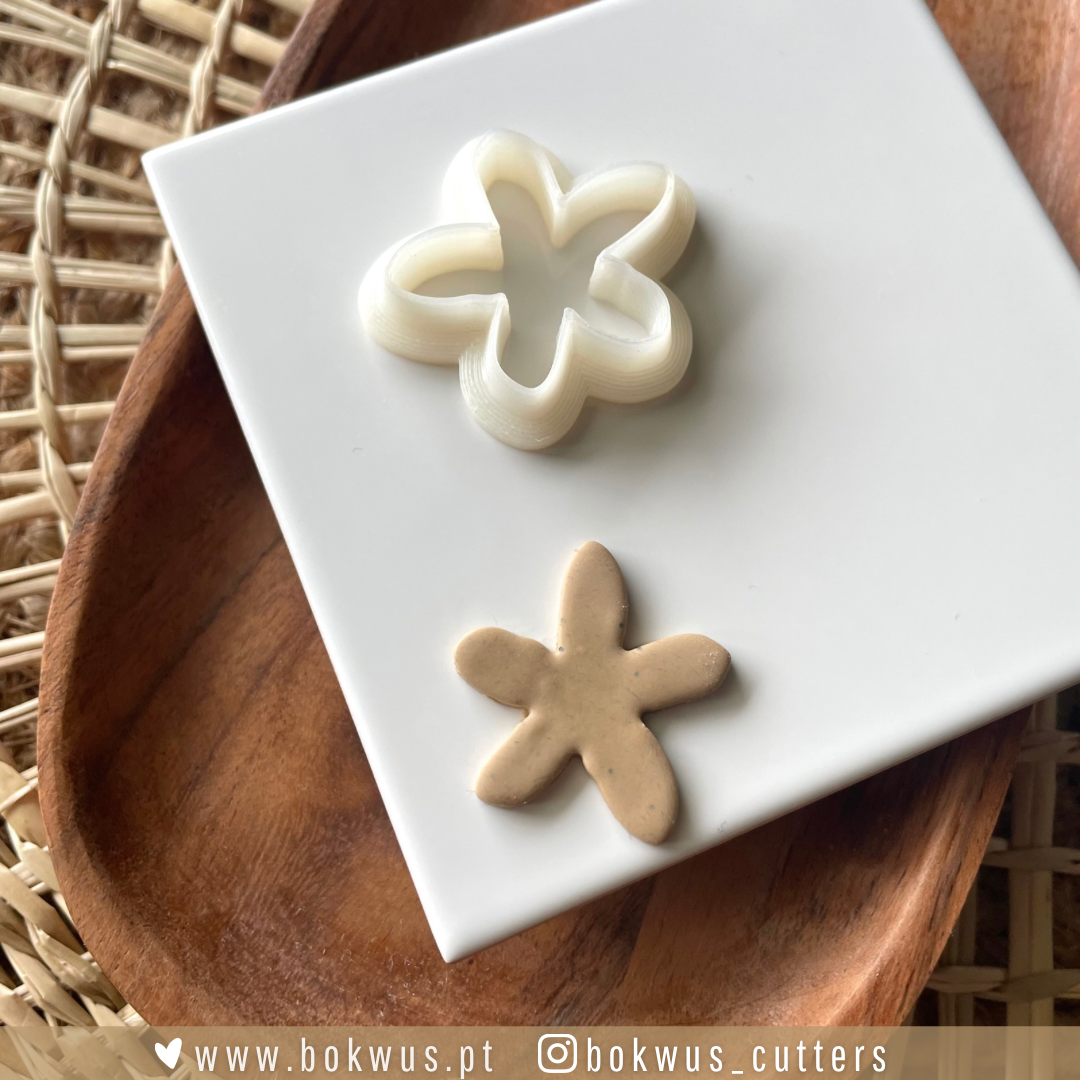 • Cortador de biscoitos branco em forma de flor com massa moldada no mesmo formato