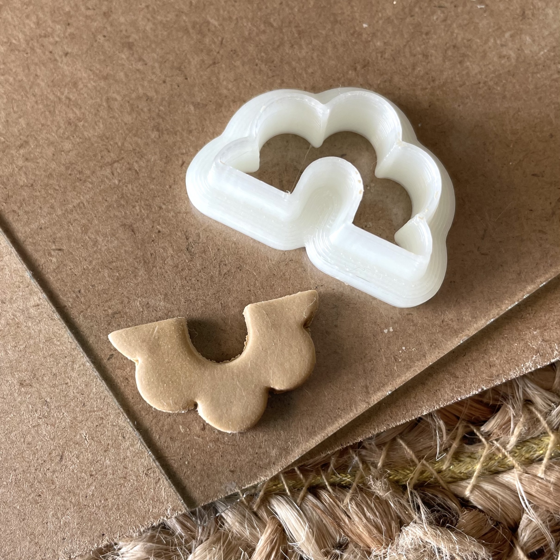 • Cortador de massa branco em forma de nuvem com efeito ondulado e pedaço de massa clara ao lado.