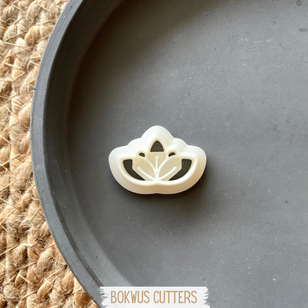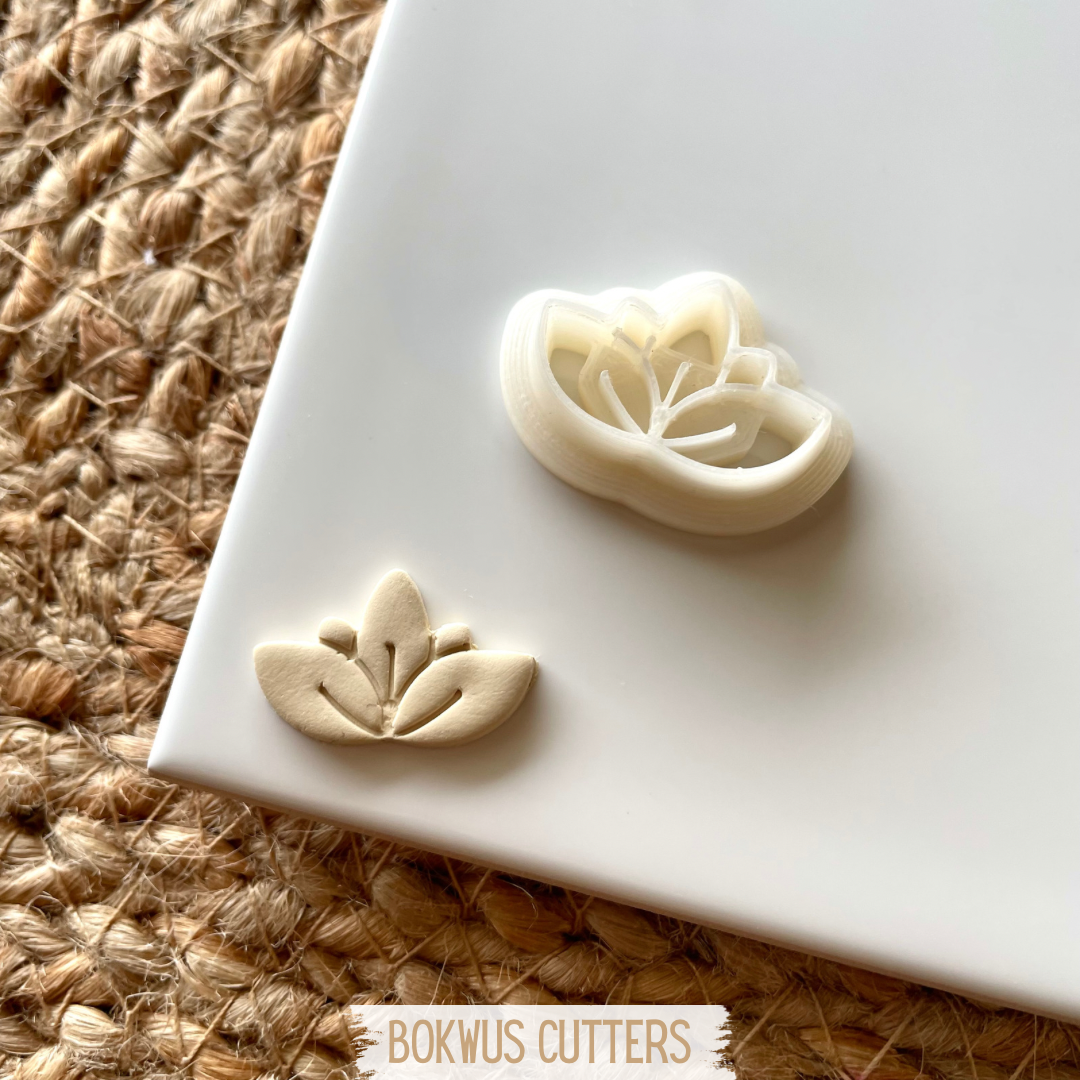 • Cortador de massa com forma de flor e peça cortada em massa bege claro