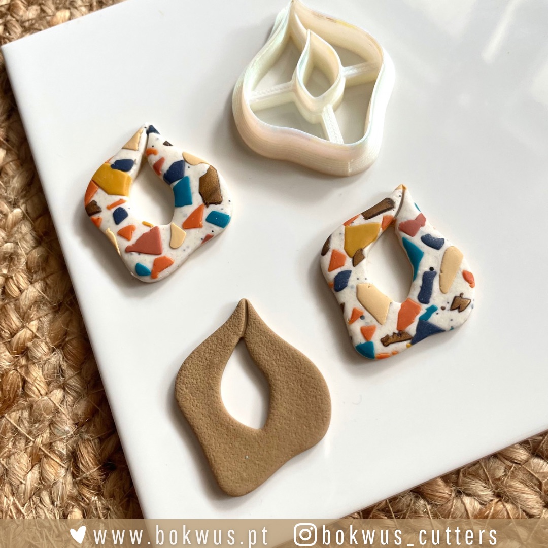 Cortador em formato orgânico e assimétrico para criar brincos modernos e minimalistas em cerâmica plástica.