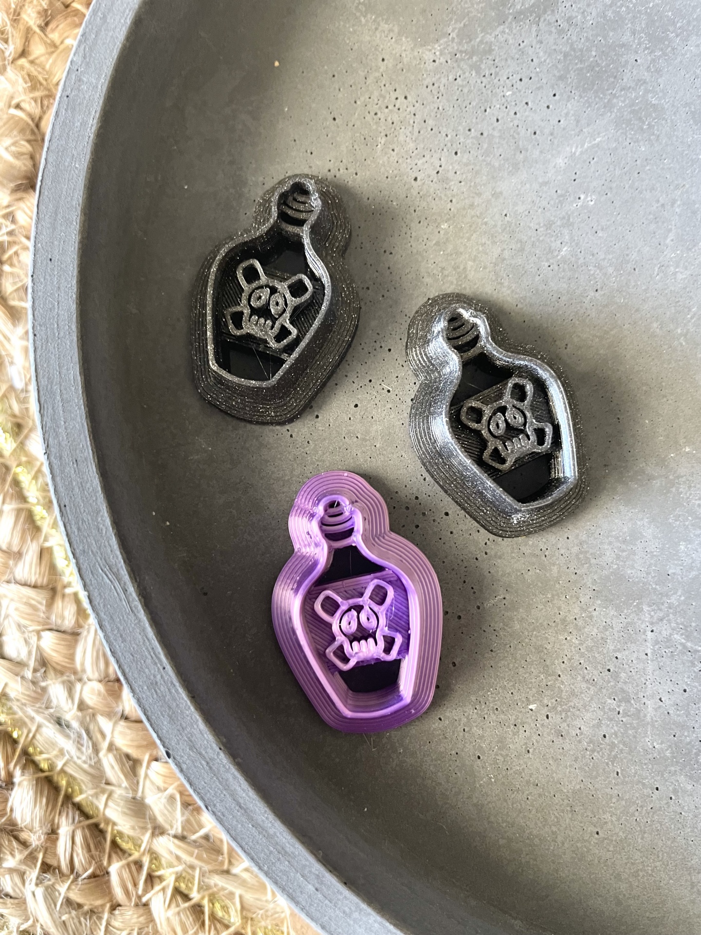 Três cortadores de biscoito em forma de garrafa com caveira, dois pretos e um roxo, numa tigela cinza
