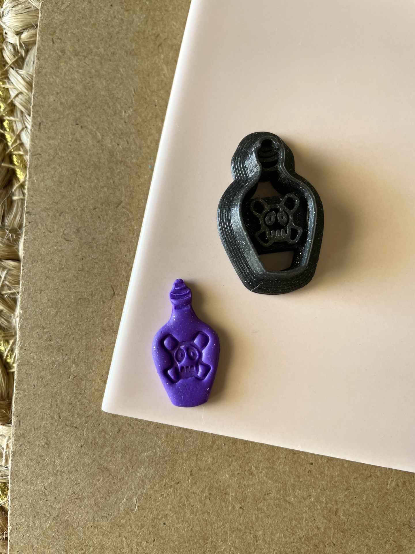 • Molde e peça em forma de frasco com caveira, plástico preto e roxo