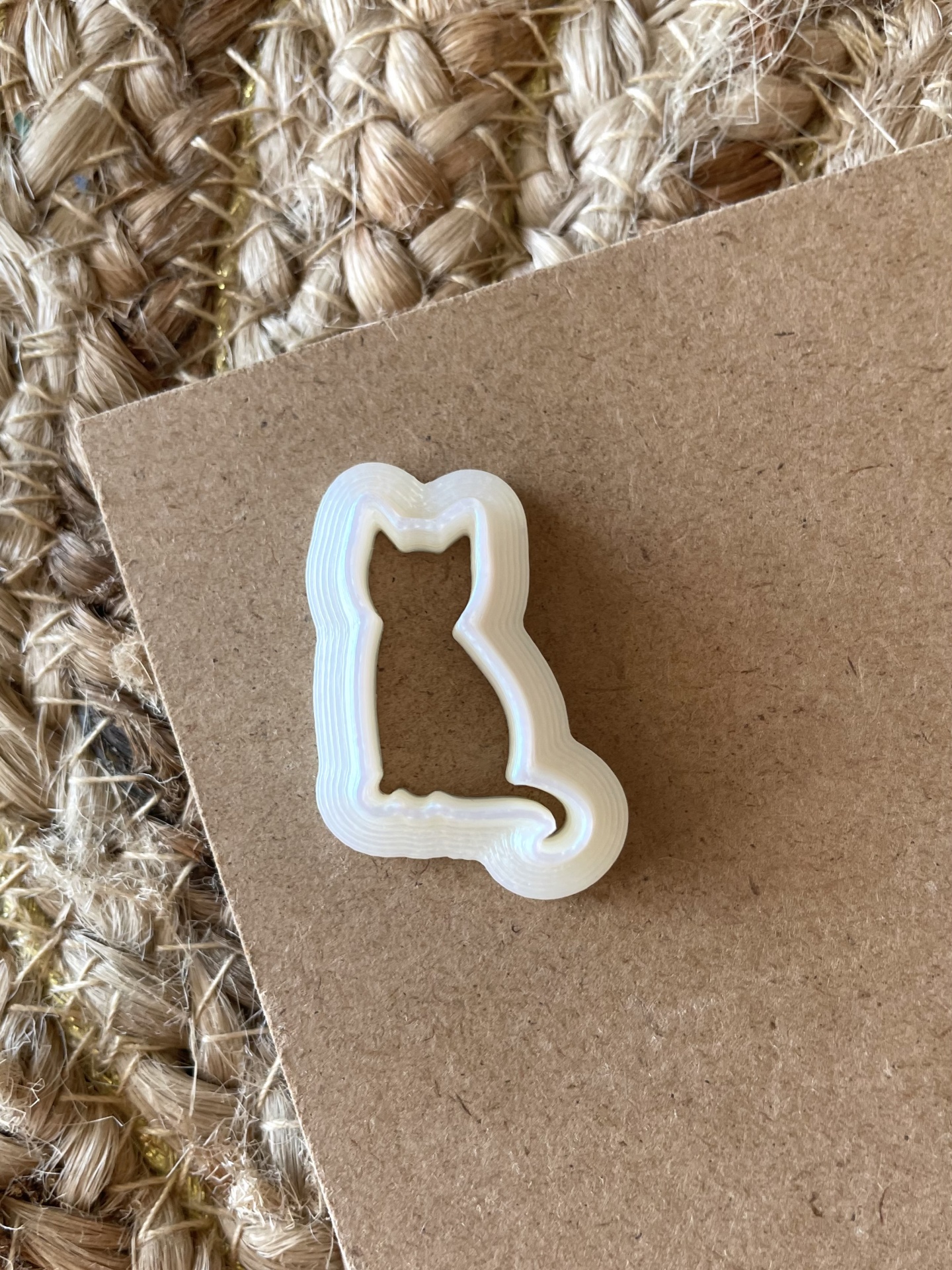 • Cortante branco em forma de gato sentado e figura cortada em pasta dourada sobre fundo rosa claro