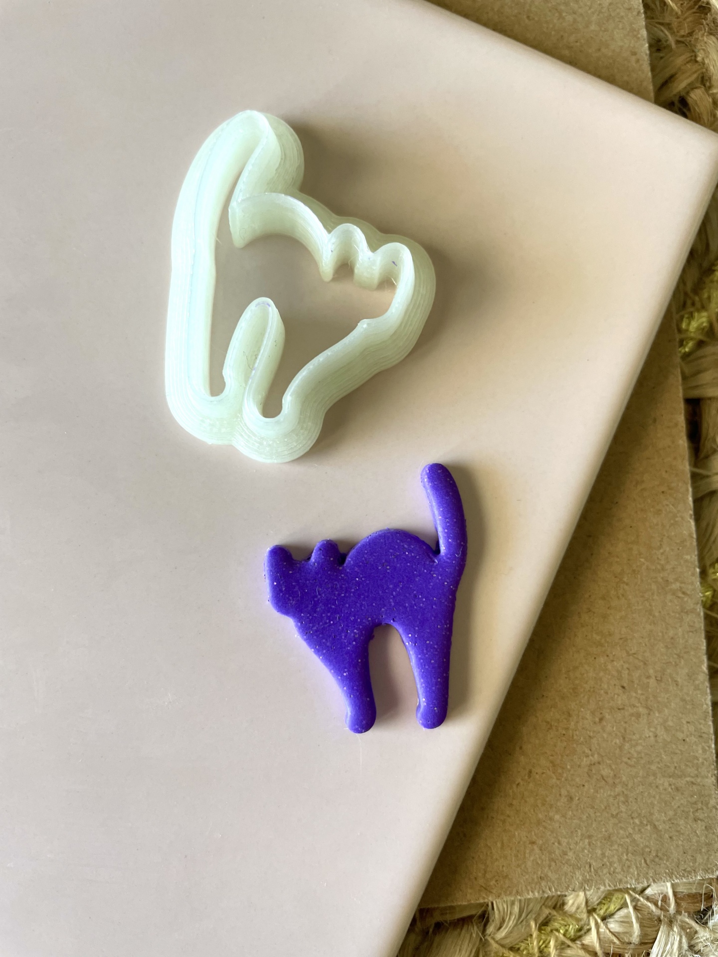 • Dois brinquedos ou moldes de plástico em forma de gato, um branco e outro roxo, sobre superfícies com cores neutras