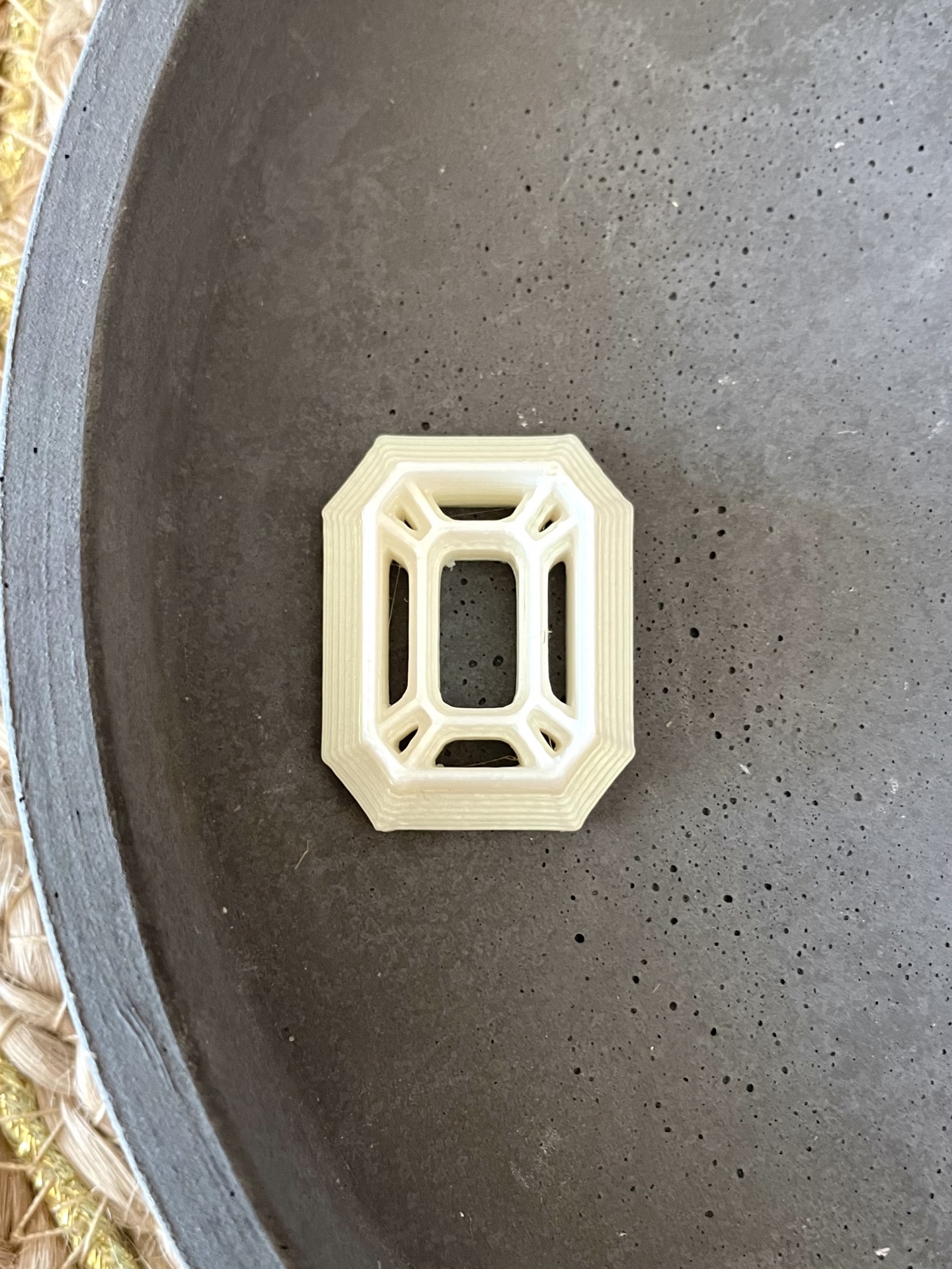 • Objeto decorativo geométrico creme sobre superfície cinzenta com textura irregular