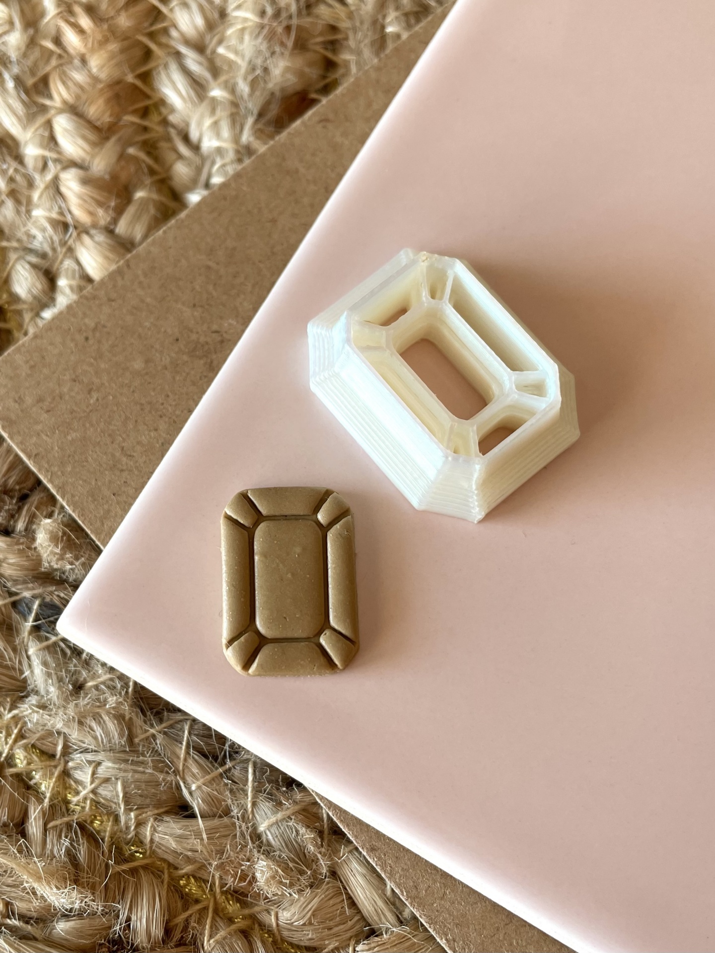 Peça retangular bege com padrão facetado ao lado de molde branco sobre superfícies diversas.