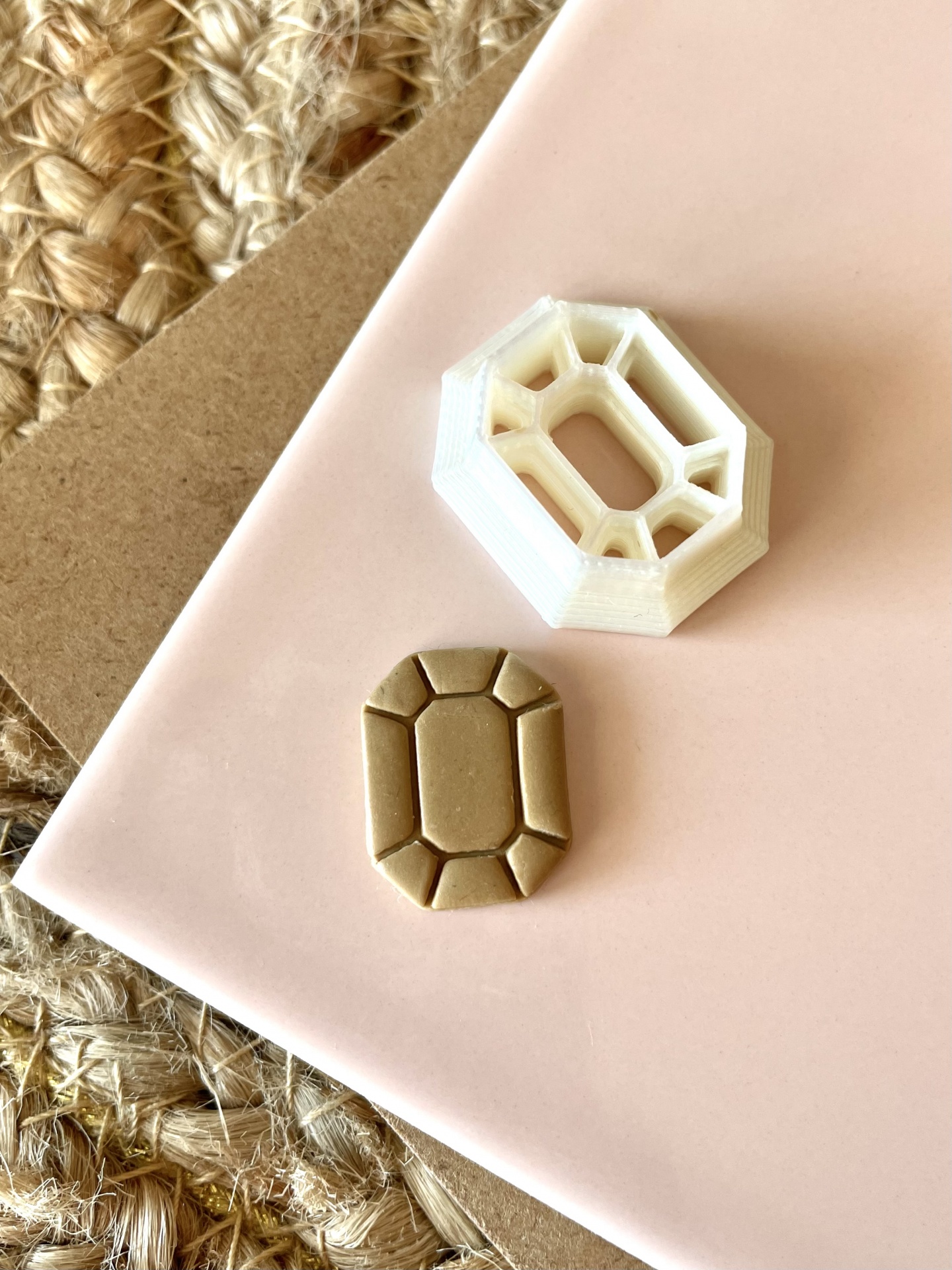 • Carimbo plástico branco octogonal e impressão dourada sobre papel e juta