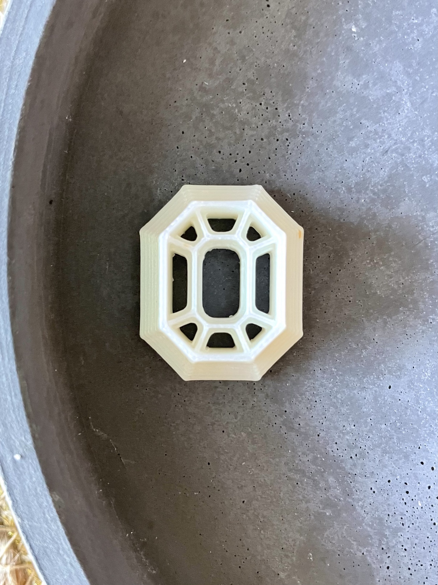 • Peça octogonal branca com recortes geométricos dentro de recipiente cinzento