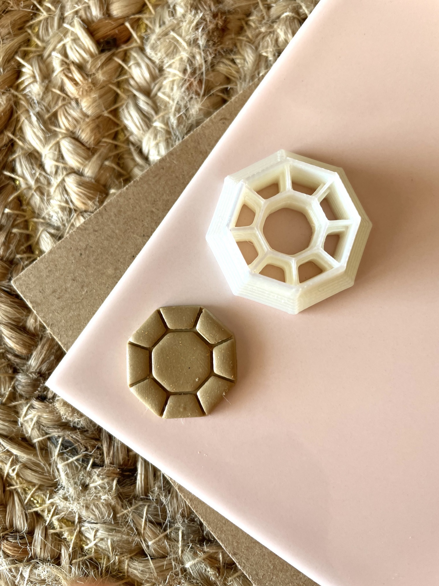 • Moldura branca poligonal e peça dourada sobre superfície rosa e tapete de fibras