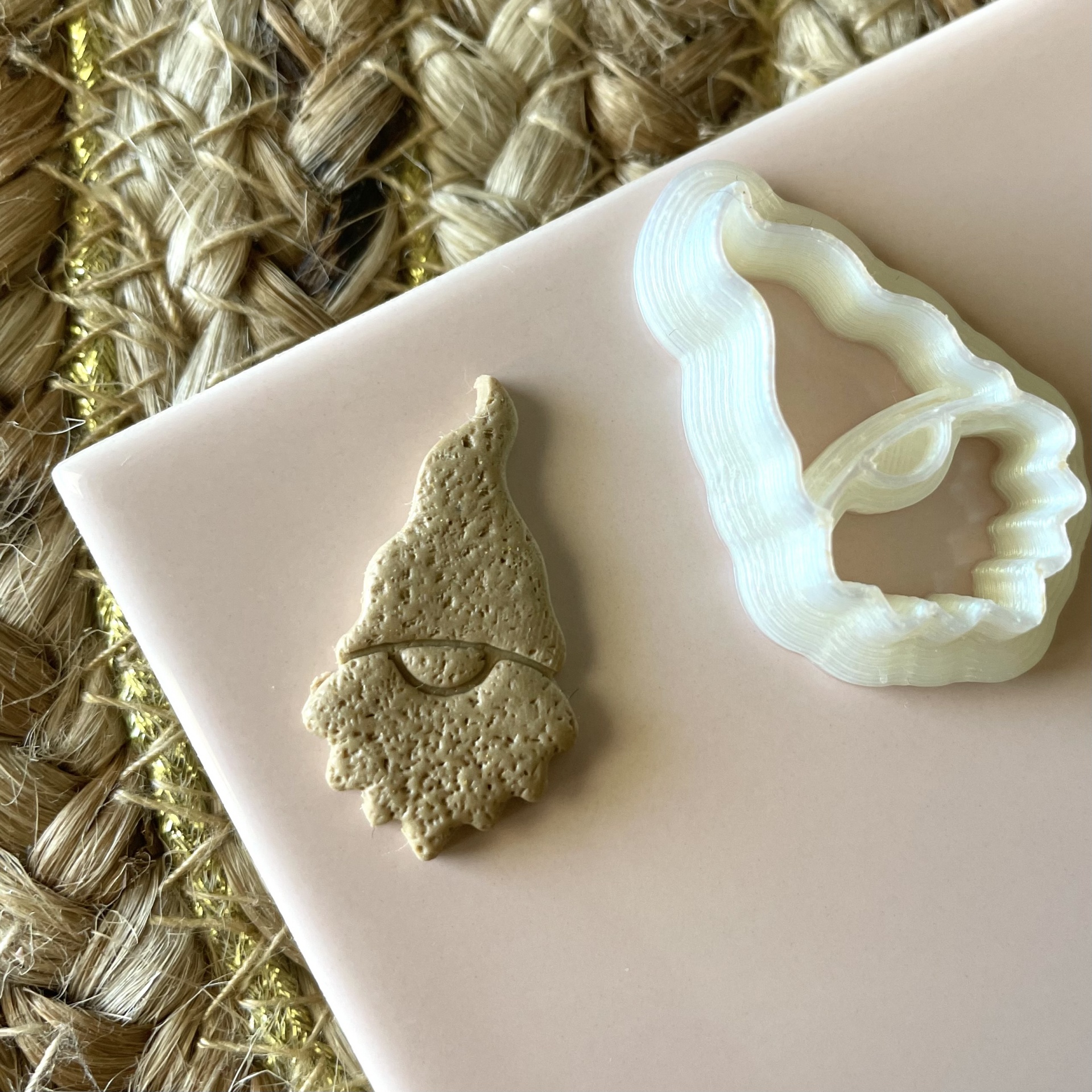 • Cortador de massa branco e figura moldada bege sobre superfície rosa claro junto a tapete de corda