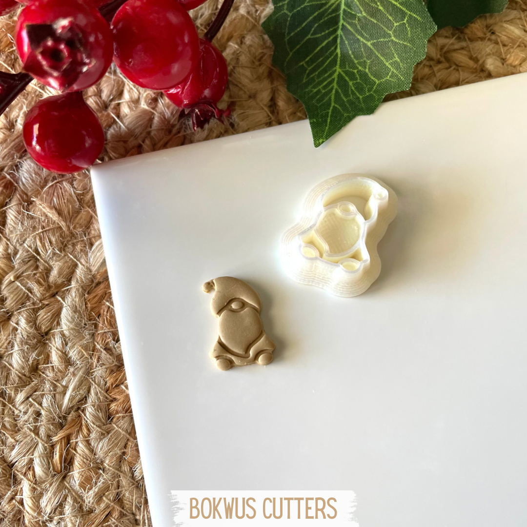 • Dois cortadores de bolachas em forma de duendes, sobre superfície branca com decoração de folhas e bagas.