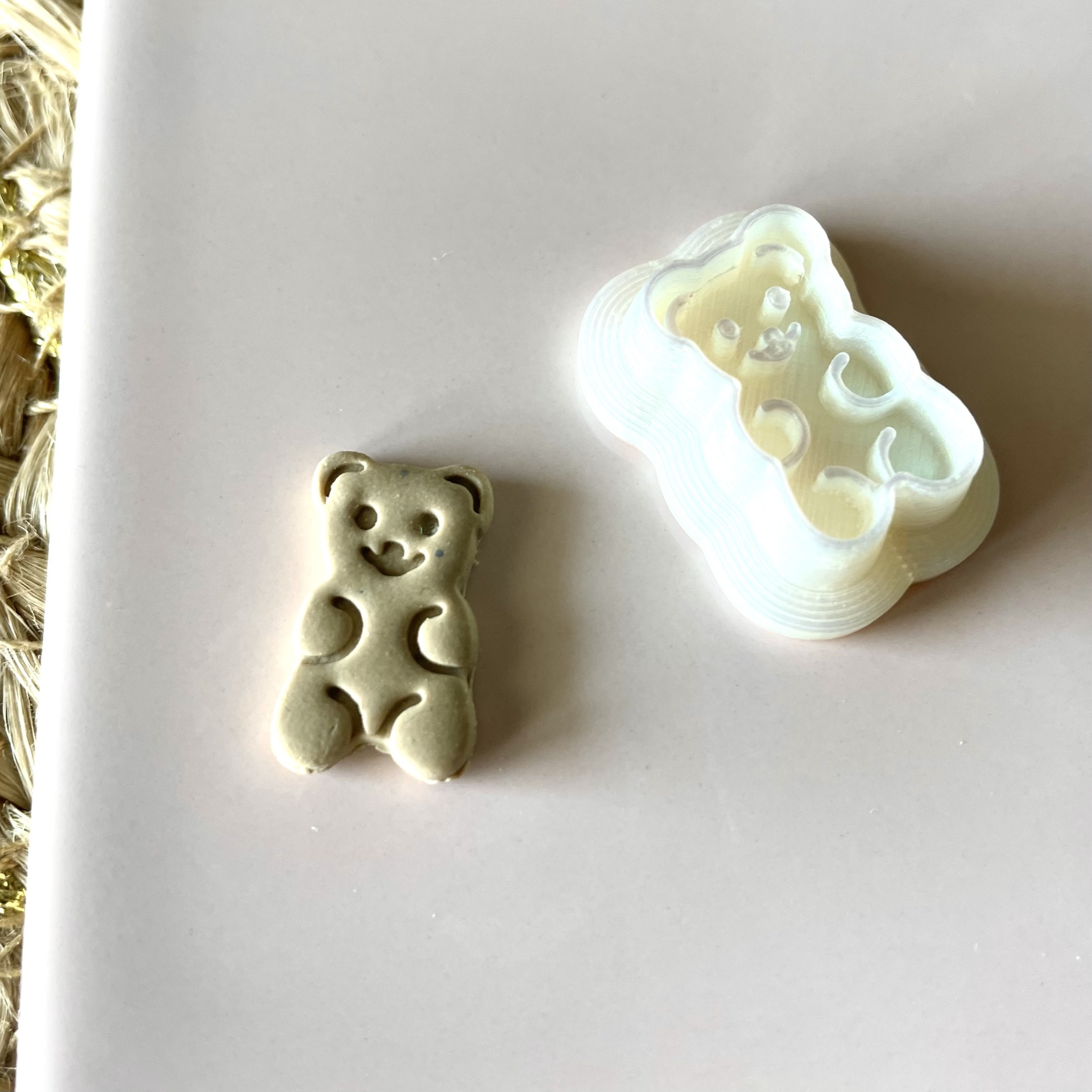 • Moldes de silicone em forma de ursinho, um branco translúcido e outro castanho, em fundo branco