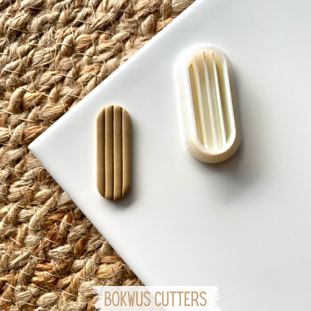 • Dois cortadores BOKWUS CUTTERS, bege e branco, com textura estriada, sobre superfície branca perto de tapete de fibras naturais.