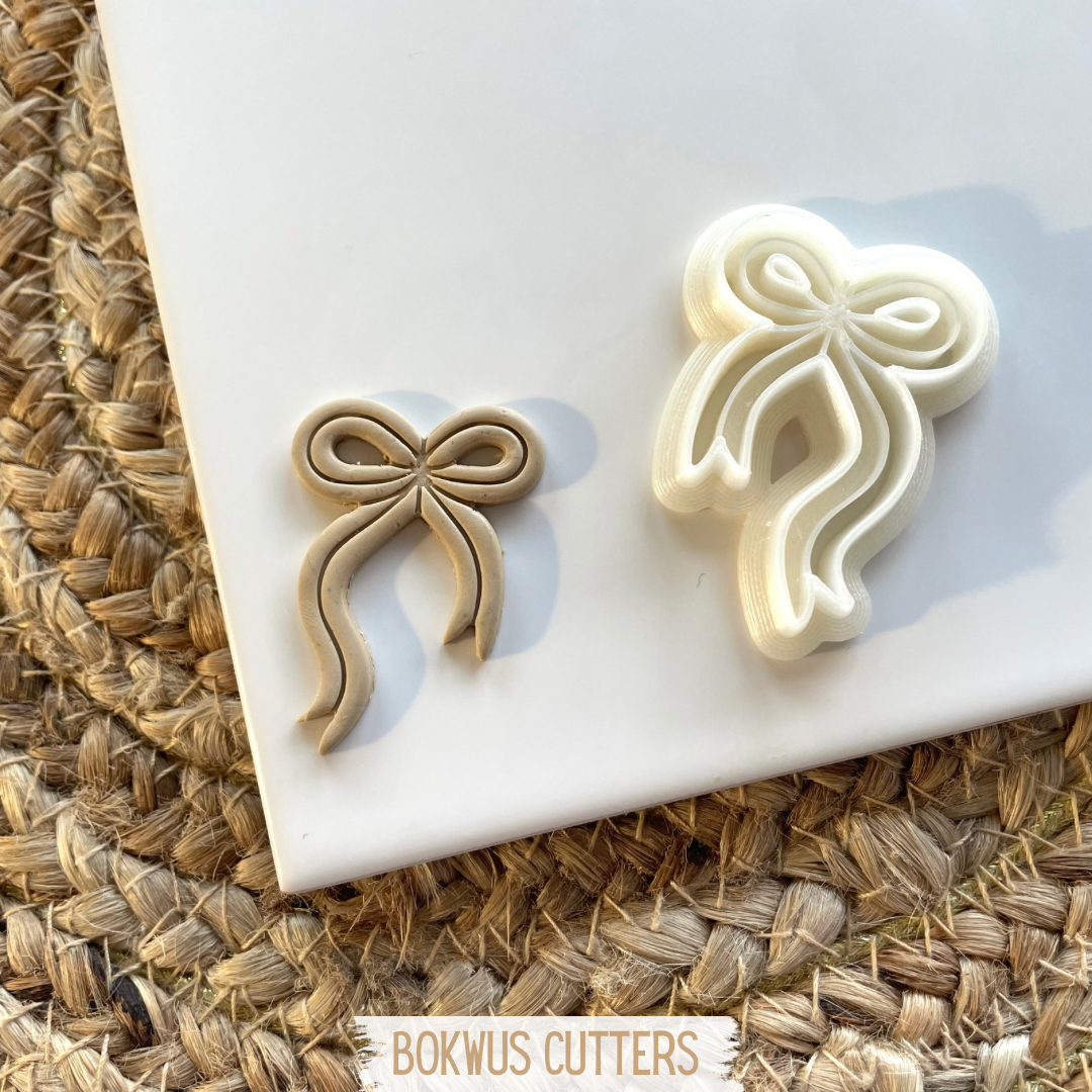 • Conjunto de cortadores em forma de laço branco num tabuleiro cinzento.