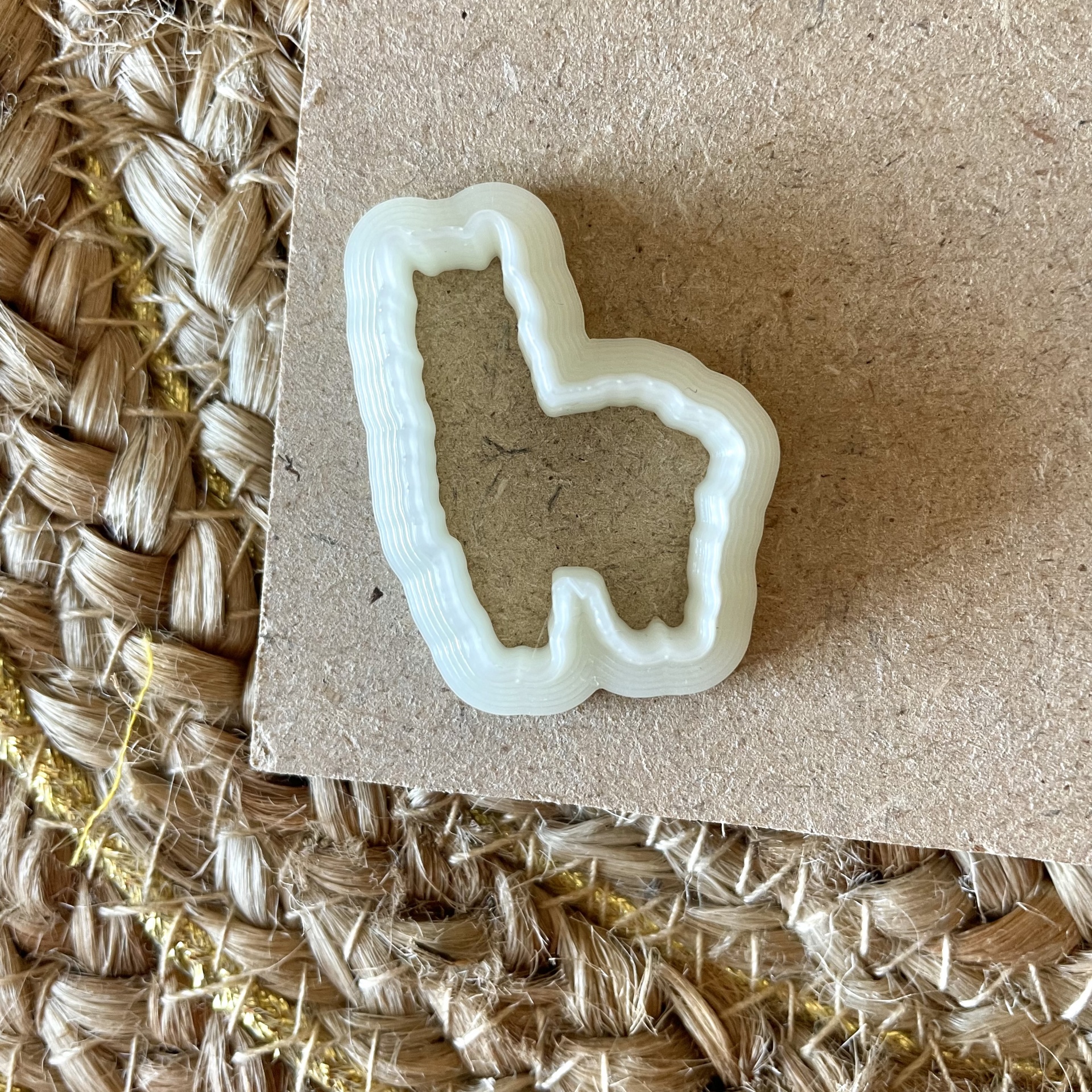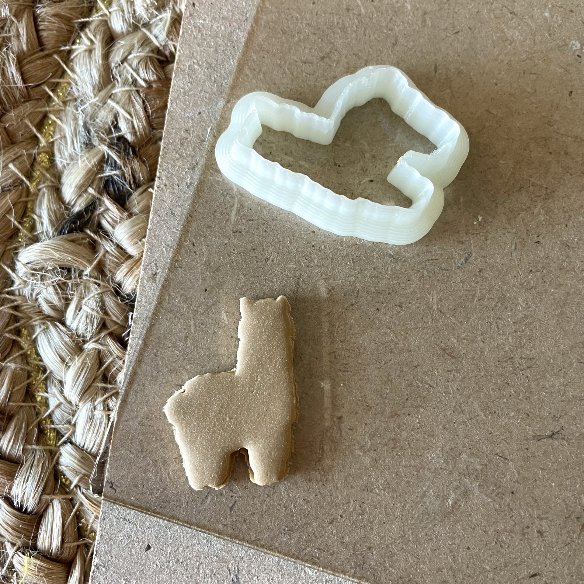 Cortador de bolacha branco e bolacha dourada em forma de alpaca sobre madeira clara