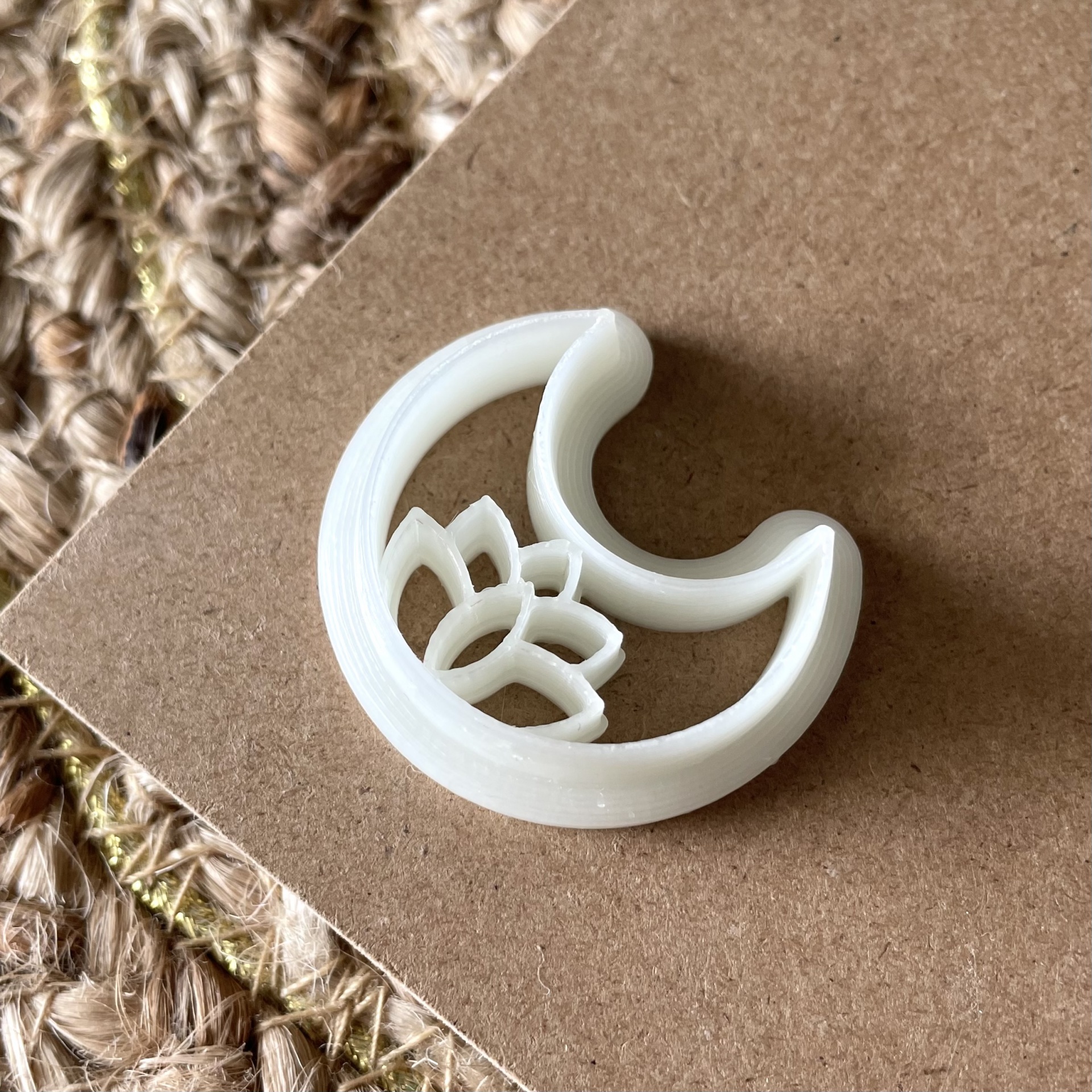 • Cortador de biscoitos branco e biscoito castanho com formato de meia-lua e design de flor de lótus
