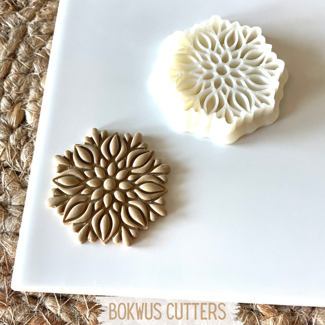 • Dois moldes para pastelaria em padrão floral, um branco e outro castanho, sobre superfície branca com texto BOKWUS CUTTERS