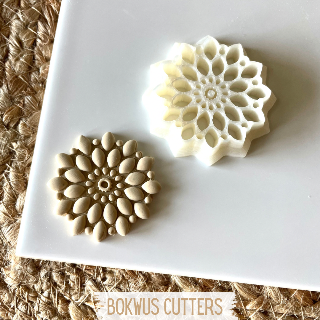 • Dois cortadores florais BOKWUS, branco e bege, sobre base branca e fundo têxtil castanho claro