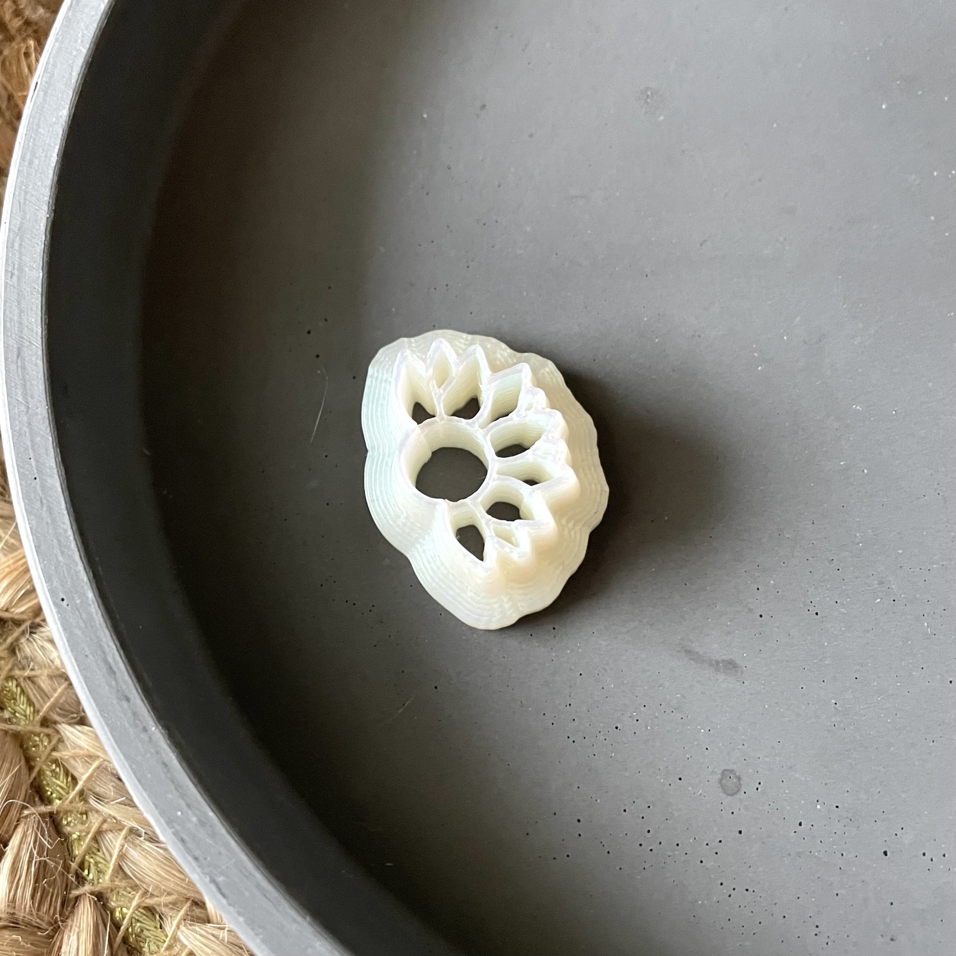 Carimbo de flor branco com impressão castanha sobre placa rosa