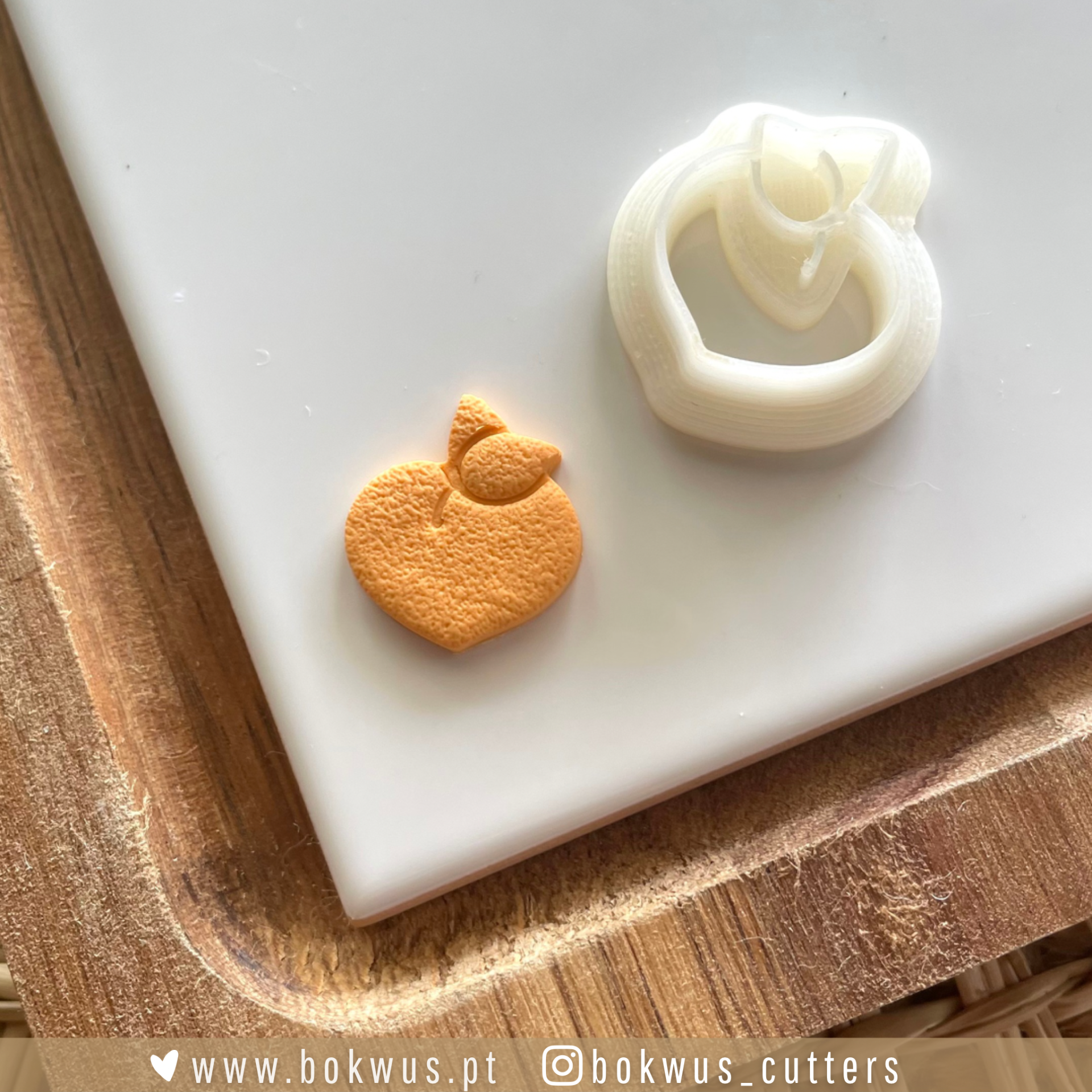 cortador de biscoitos em forma de pêssego com biscoito laranja em superfície branca e tábua de madeira