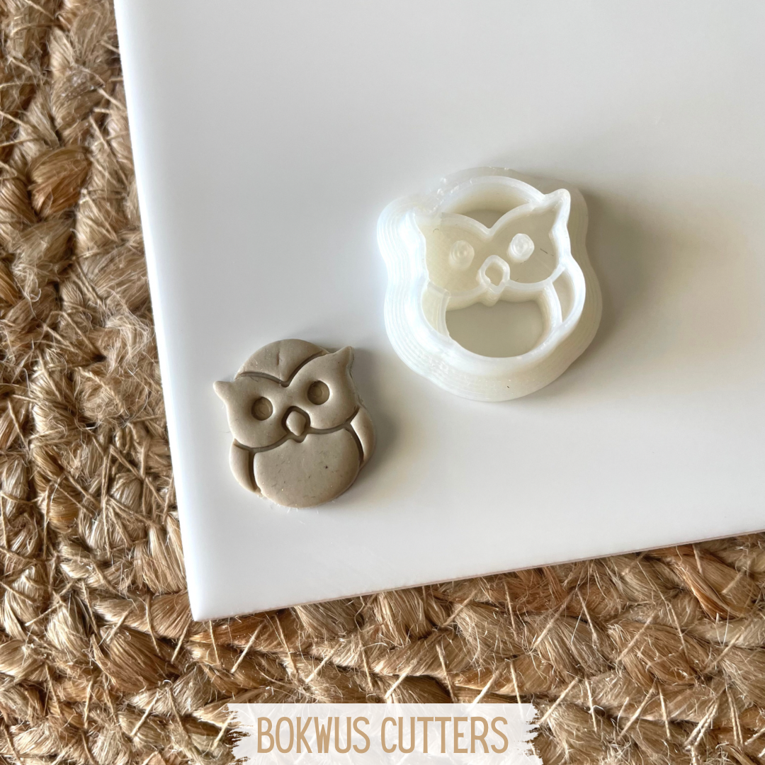 • Cortador de biscoitos em forma de coruja com massa moldada, sobre superfície branca e textura natural