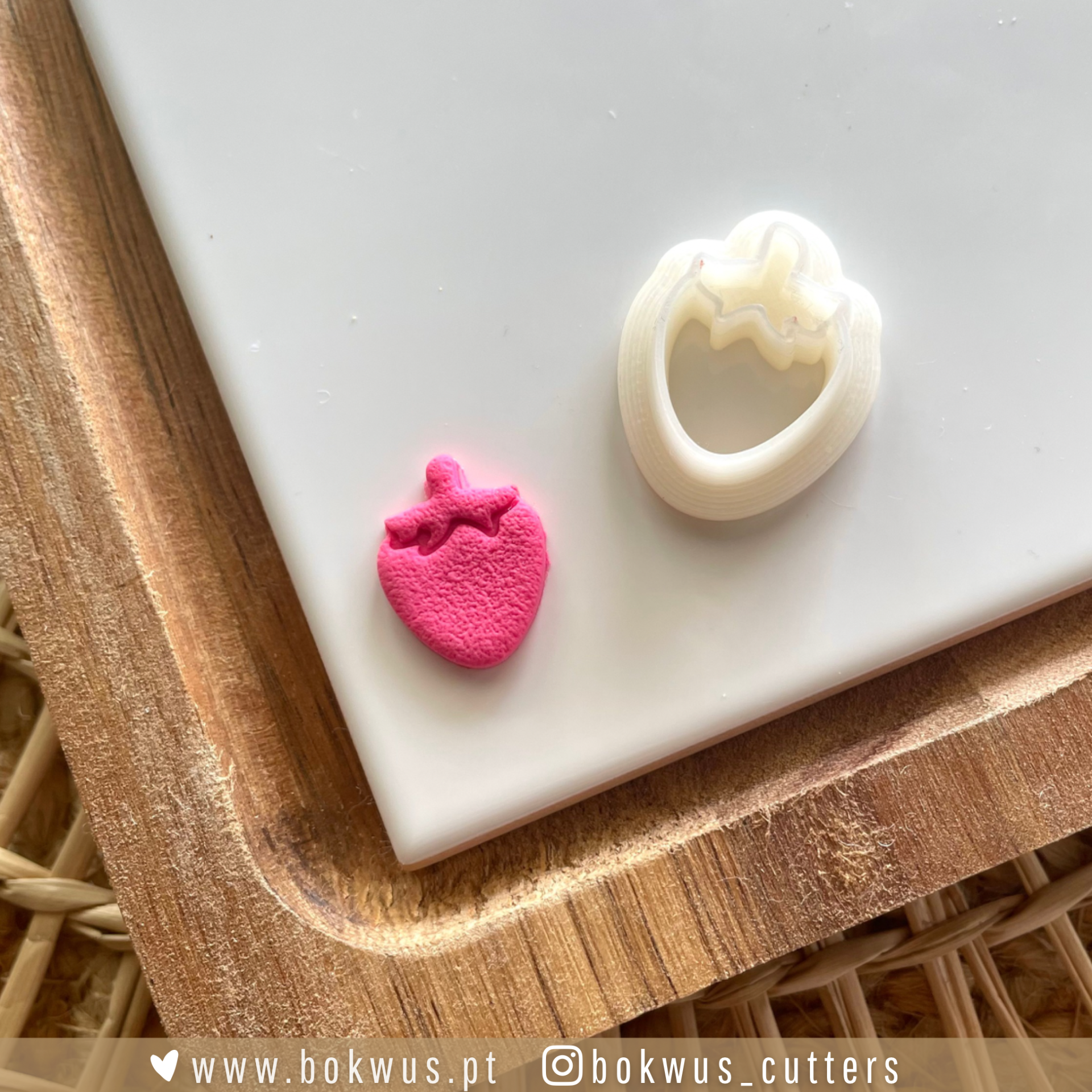 • Cortador de biscoitos branco em forma de morango com peça rosa de massa modelada sobre bandeja de madeira