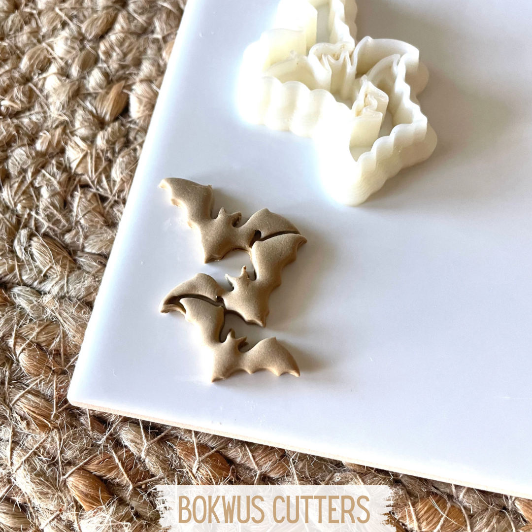 • Molde de corte branco de morcegos num prato cinzento com texto BOKWUS CUTTERS