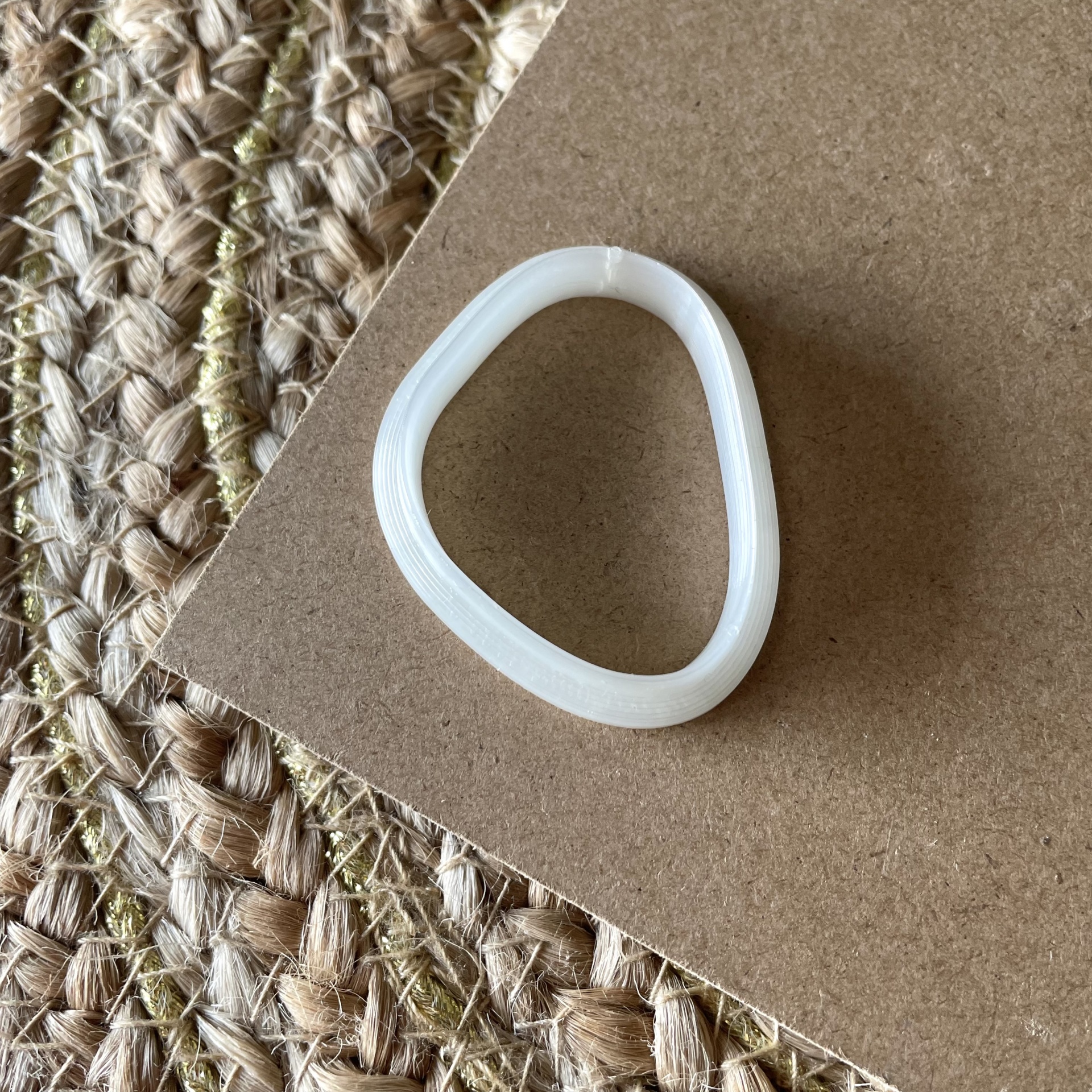 Anel elástico branco sobre cartão castanho e tecido de fibras naturais entrelaçadas