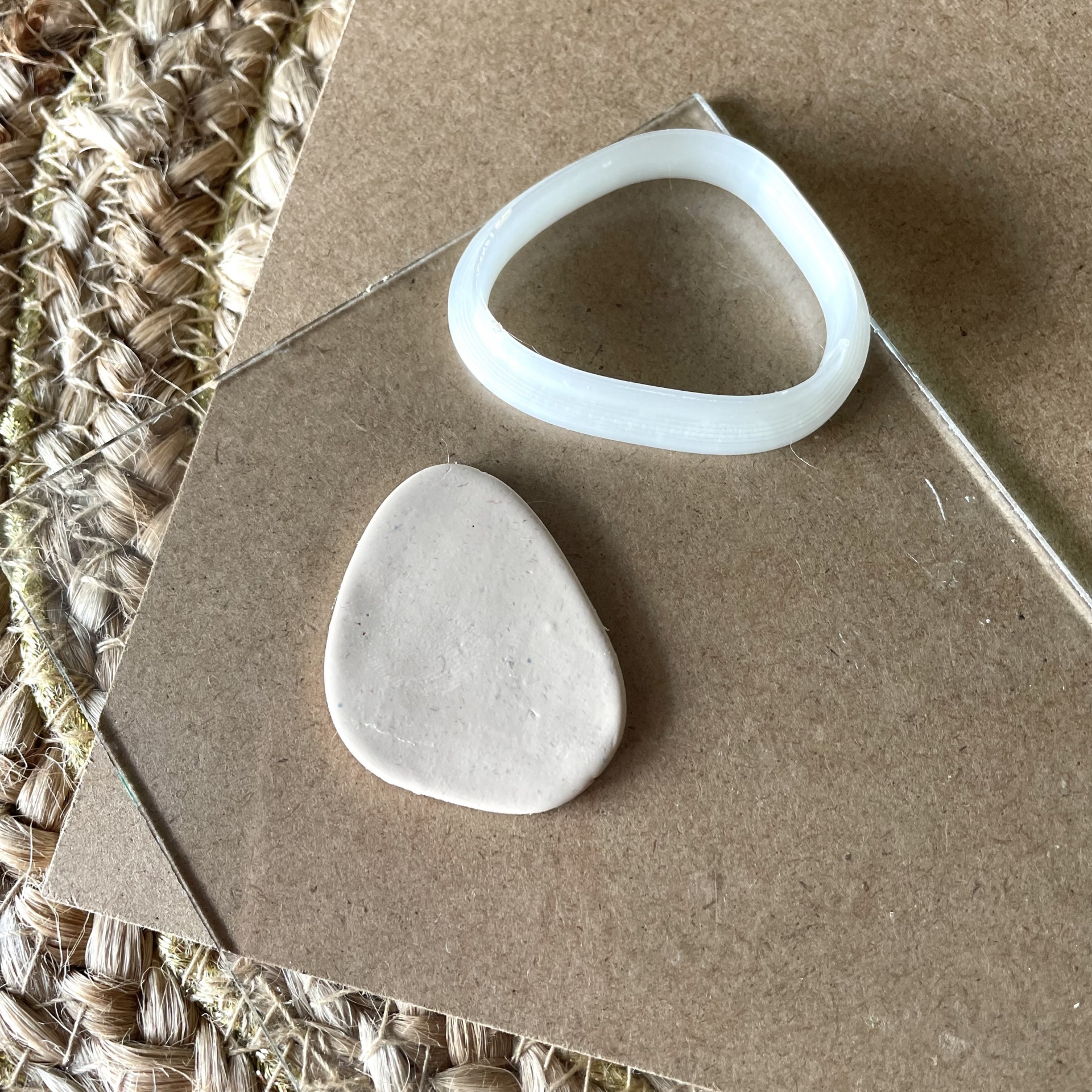 • Forma de silicone branca triangular irregular e peça plana branca sobre superfície castanha