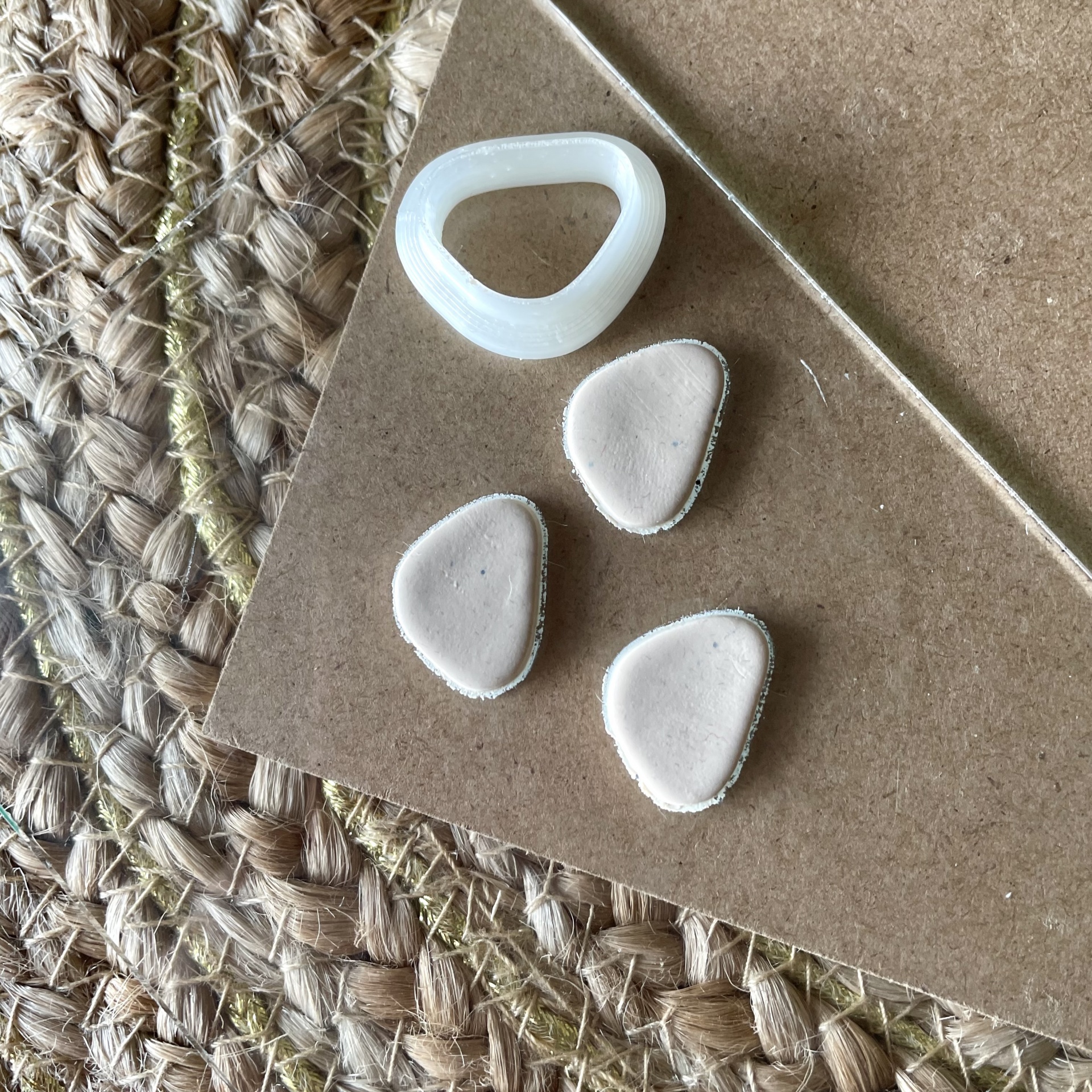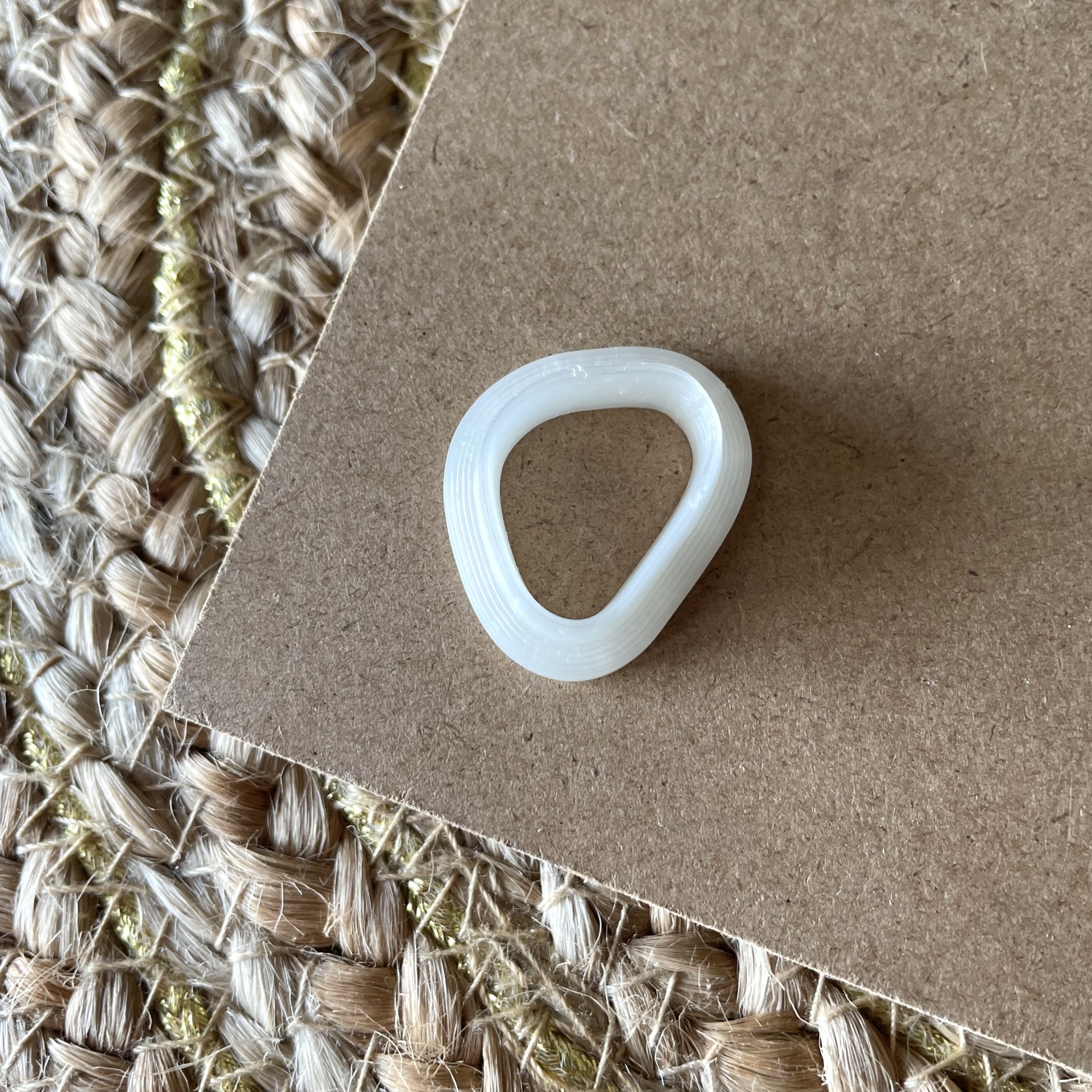 • Anel plástico branco triangular sobre cartão e tapete de fibras naturais