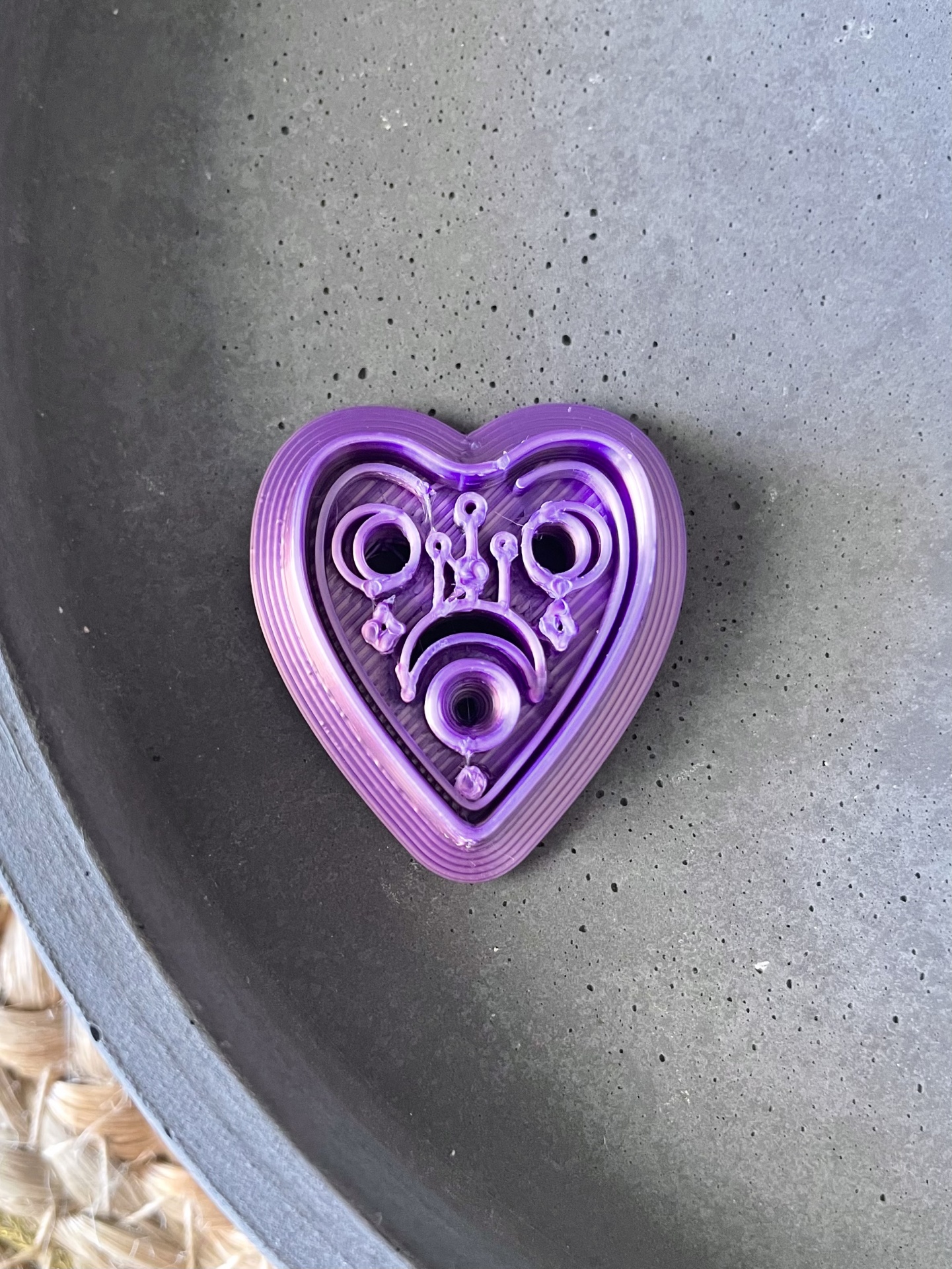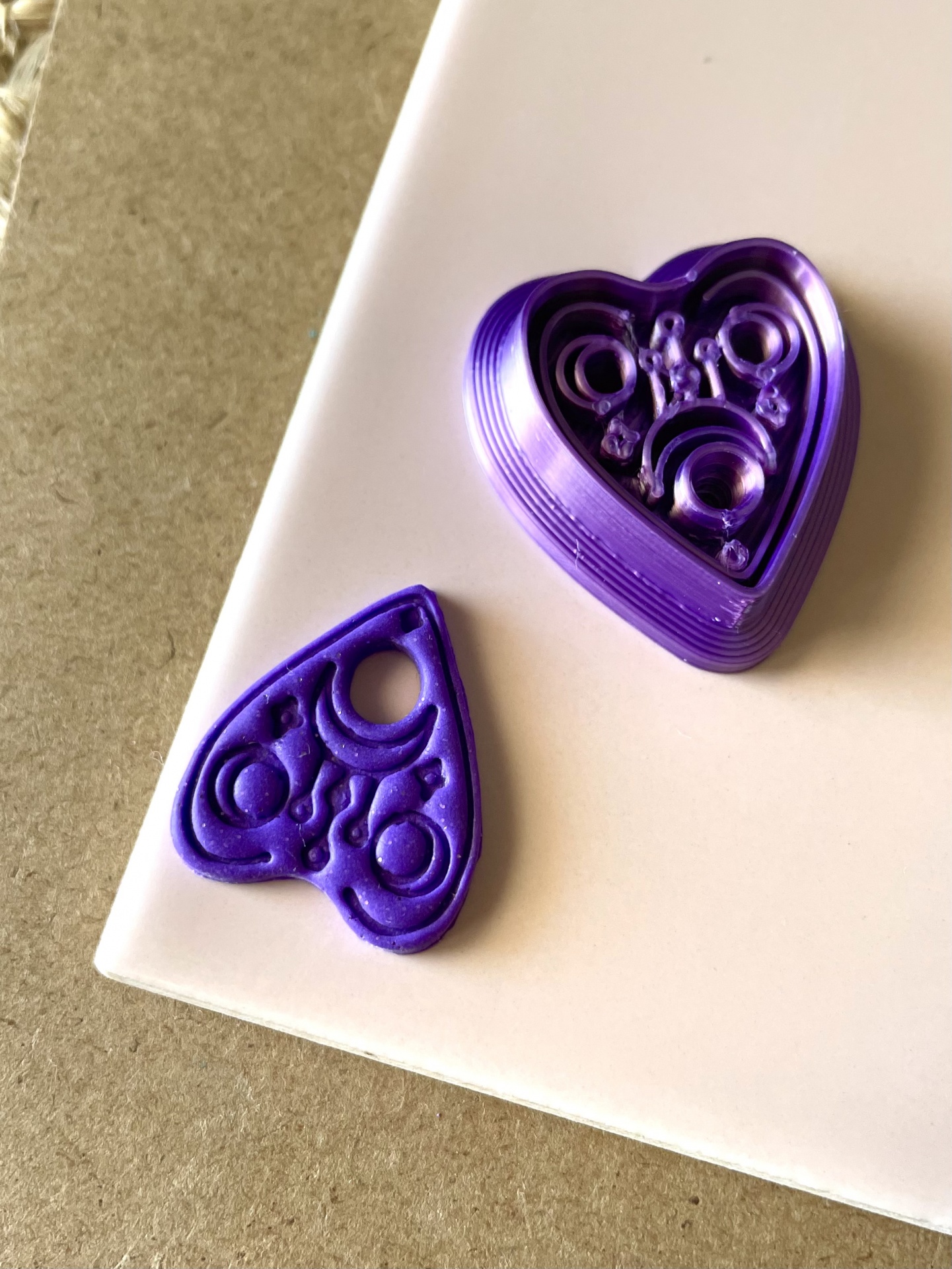 • Moldes de impressão 3D roxos em forma de coração com texturas internas, sobre superfície branca e fundo castanho