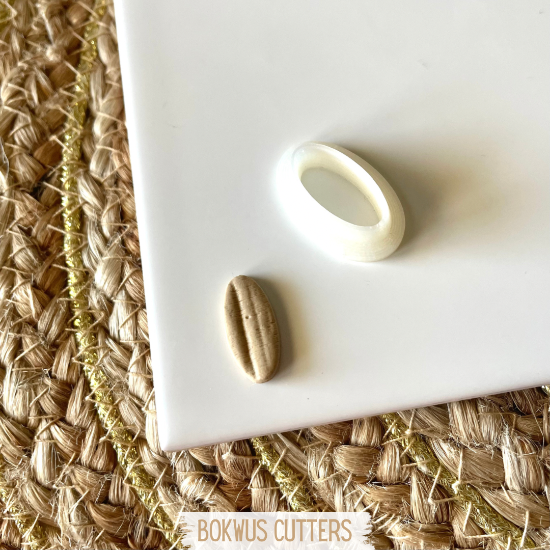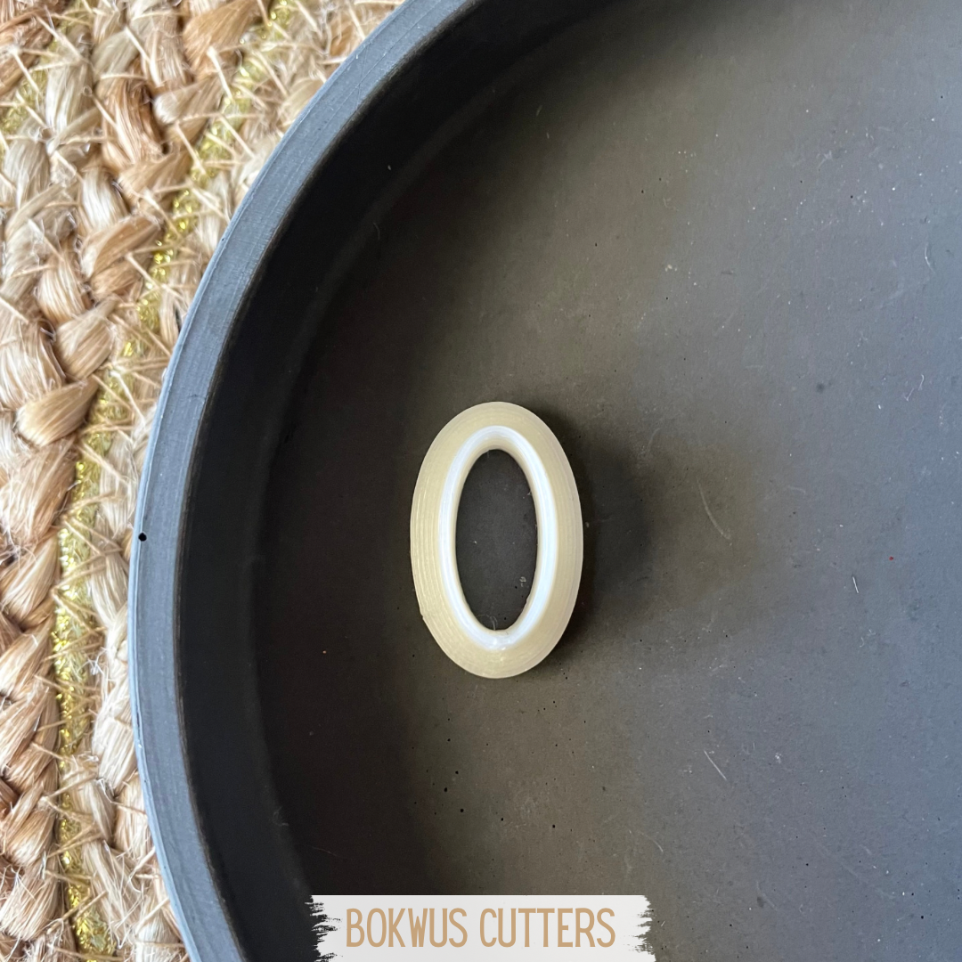 • Cortador oval branco da BOKWUS CUTTERS sobre superfície branca e base de tecido trançado natural com detalhes dourados