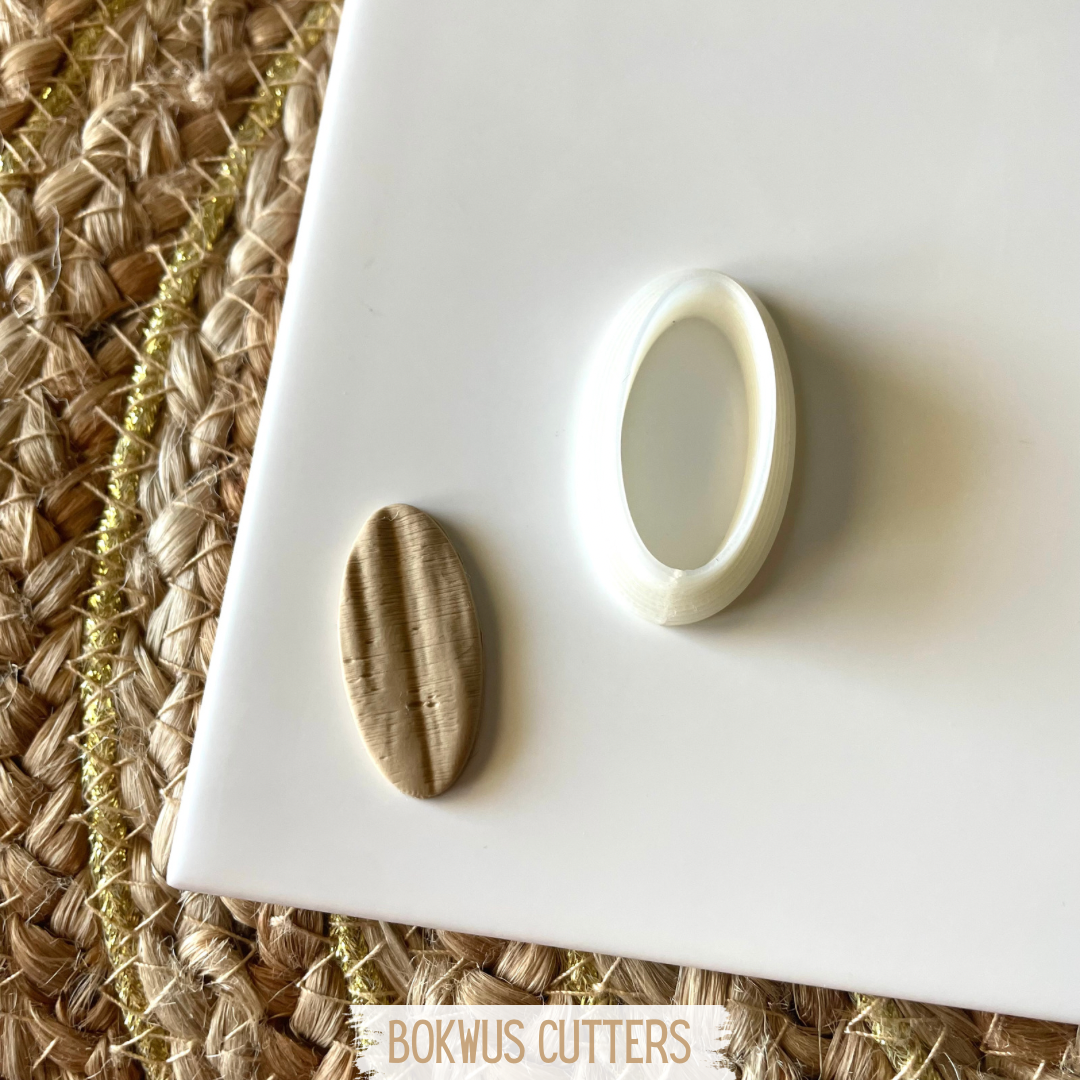• Dois cortadores, um oval branco e outro castanho com padrão, sobre superfície branca e tapete de palha